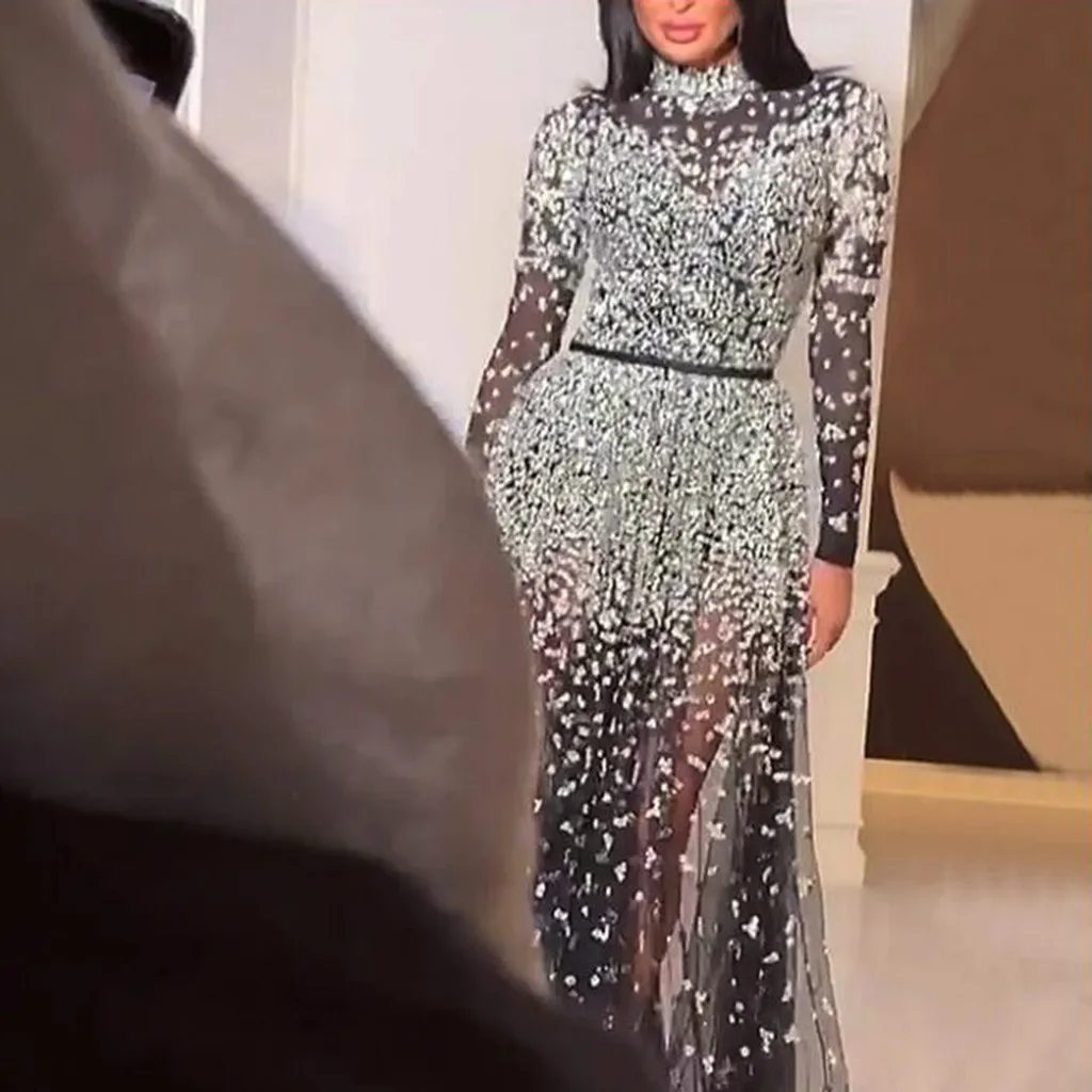 Women's Sexy Solid Color Long Sleeve O-Neck Lace See Through Long Full Dress