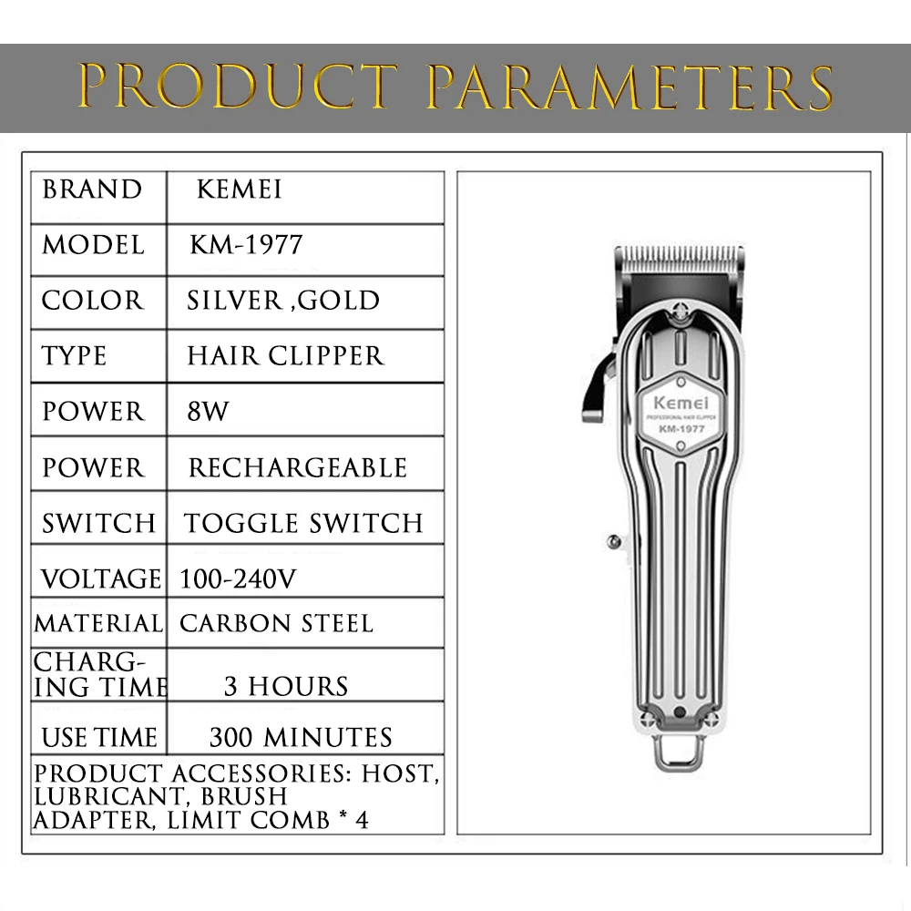 Спецификация Название бренда: kemei Номер модели: KM-1976 /KM-1977 Тип питания: перезаряжаемый Использование: лицо, борода, усы, парикмахер. Время использования: 300 минут Время зарядки: 3 часа напряжение: 100-240 В, 8 Вт Цвет: серебристый или золотой Материал: АБС-пластик Вес: 370 г Размер: 18 см * 5 см