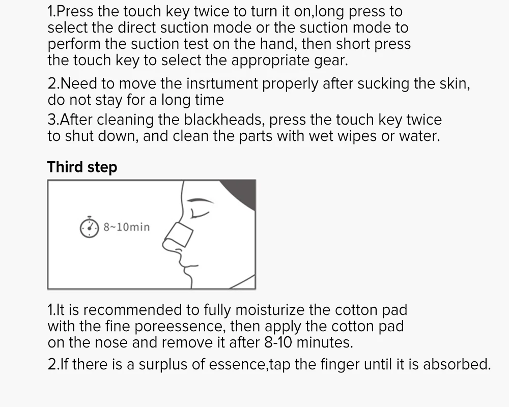 Изогнутая выпуклая конструкция 30 ° больше подходит для кожи лица, которая не только усиливает всасывание, но и защищает кожу, мягко сжимает поры, удаляет глубокие загрязнения пор и вытесняет черные точки.