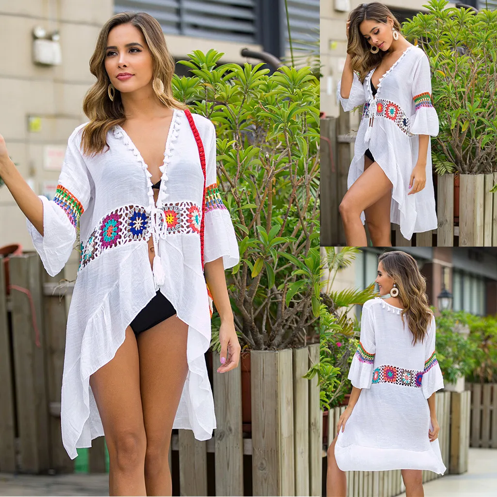 Летняя Пляжная накидка в стиле бохо для женщин Купальники вязаная крючком пляжная туникаСексуальный купальникЖенскийПляж парео-белый