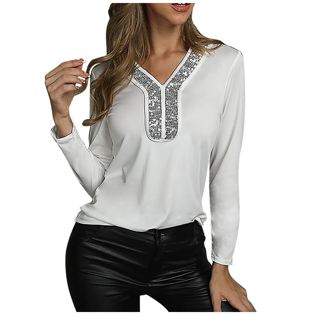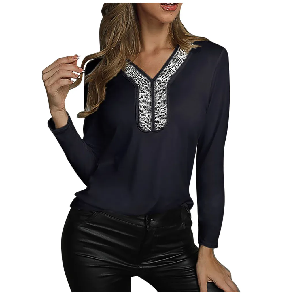 Описание Модная женская однотонная Лоскутная футболка с длинными рукавами и блесткамиОсобенности: