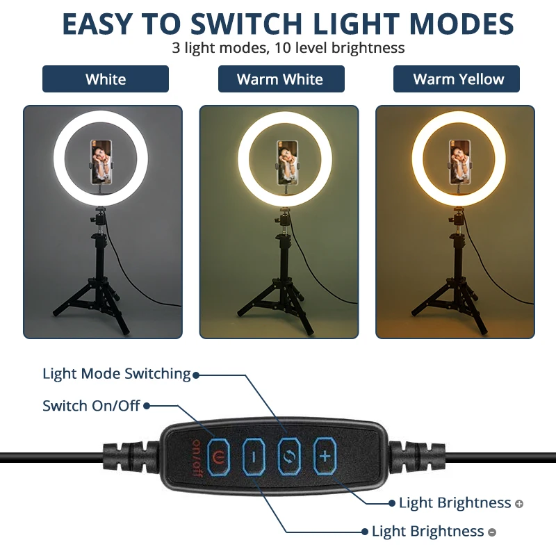 1. Светодиодный светильник имеет 10 регулируемый уровень яркости выбор для вас, чтобы удовлетворить все ваши потребности в различных условиях. 2. Три светильник ing режимы: теплый светильник, белый светильник, теплый белый светильник. Он пригодится, когда вам понадобится дополнительный светильник для макияжа, фотографирования, создания видео, чтения книг и потокового воспроизведения. 3. Питание USB: работает с большинством устройств, поддерживающих usb-порты (ноутбуки, ПК, мобильные источники питания, зарядные устройства USB, адаптеры переменного тока и т. д.) вы можете легко управлять шнуром питания вкл/выкл или переключаться в Предпочтительный режим освещения. 4. Складной штатив: длина стойки может растягиваться до 45 см, светильник легко переносится.