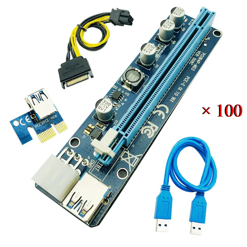 100 шт. обновленная версия VER 008C PCI-E Riser Express Riser Card 1x до 16x удлинитель 6Pin кабель питания для BTC Miner Mining Machine