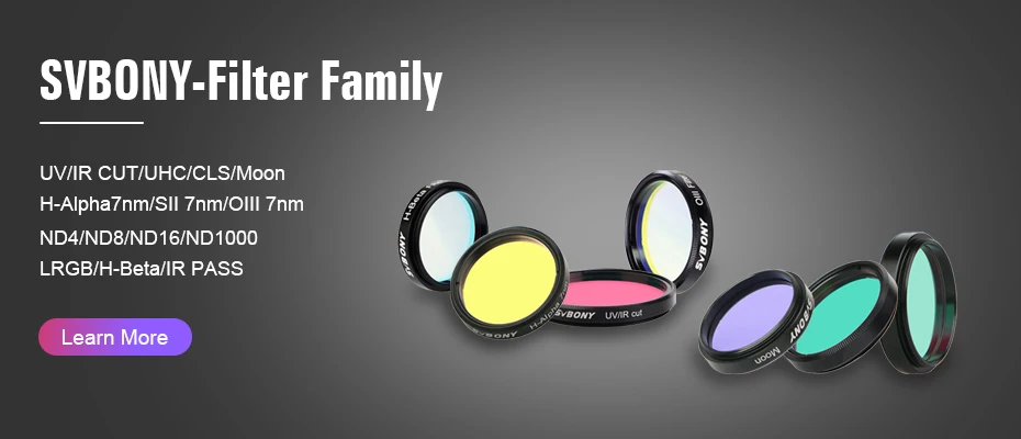 SVBONY SV133 is ideally suitable for visual observations with 2" eyepieces. And with the included adapter it is also perfectly suitable for astrophotography with single lens reflex cameras and CCD cameras (M48 to M42 adapter exclude). The included adapter comes with a locking ring, whereby high-precision distance regulation becomes possible. It’s very sturdy aluminum housing makes it also suitable for heavy cameras. The filters can be changed very quickly at any time, even with the camera mounted or with the eyepiece inserted.