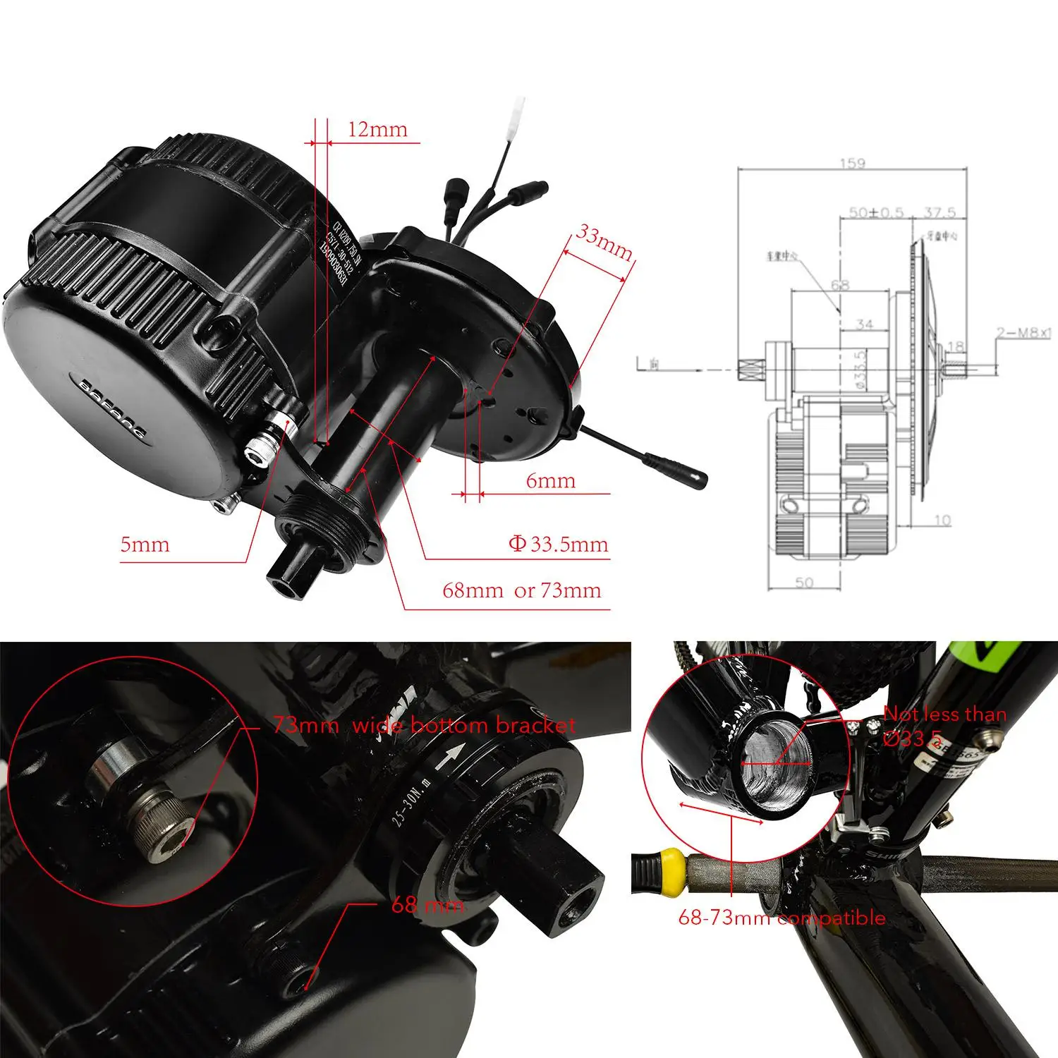 Этот двигатель среднего привода предназначен для велосипеда с широким нижним кронштейном 68 мм (2,68 дюйма) или 73 мм (2,87 дюйма). Внутренний диаметр кронштейна должен быть не менее 33,5 мм. Мы отправим дополнительные шайбы и болты для нижнего кронштейна 73 мм.