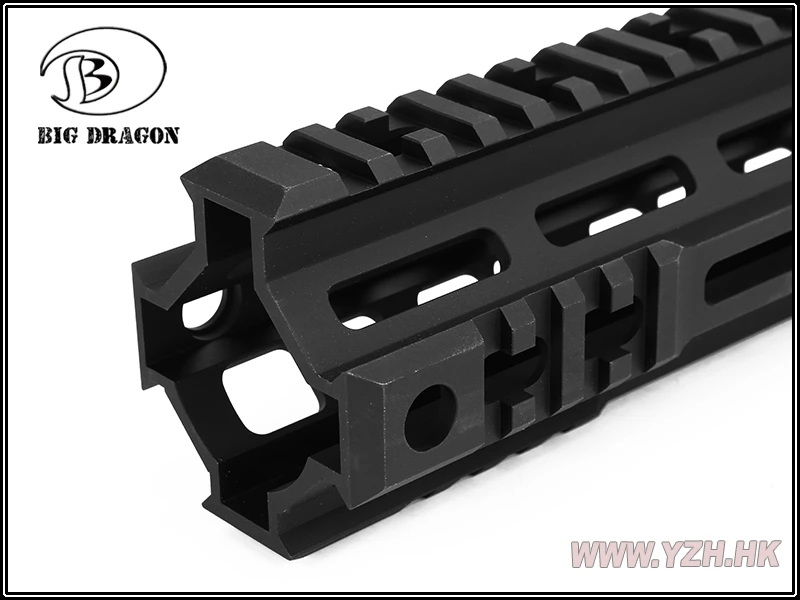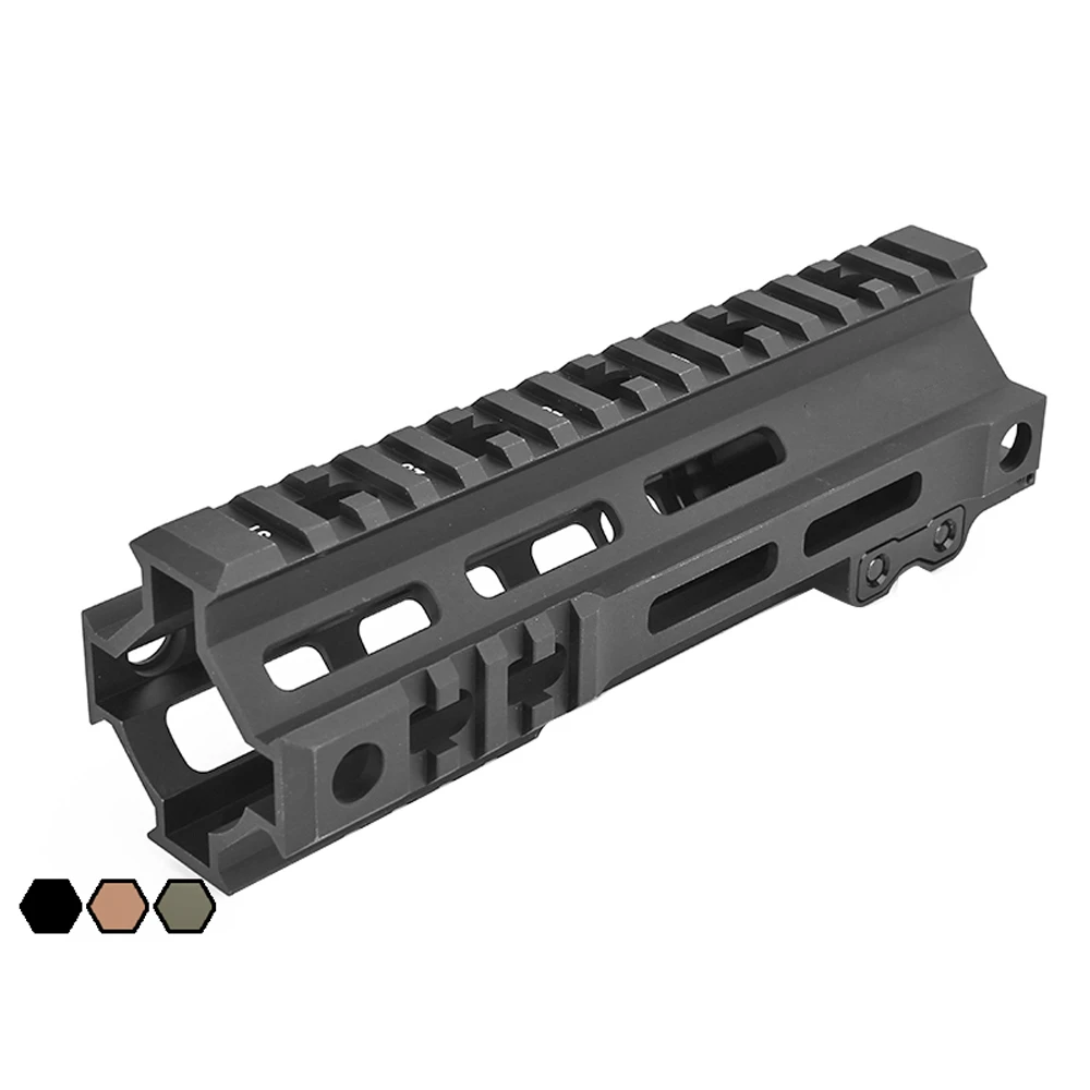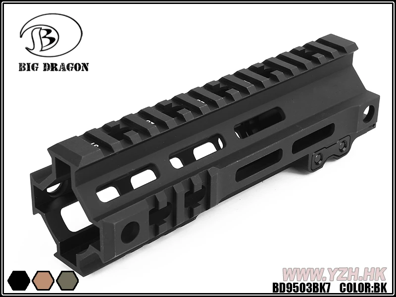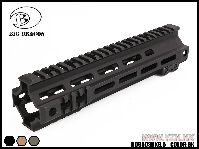 Совместимость с M-LOK M1913 Интегрированные рельсовые секции Пикатинни на передней части рельса в 3, 6 и 9 часов Высота: 2,3 дюйма (5,8 см) Доступные длины: 7 ″ (17,8 см), 9,5 ″ (24 см) Доступные цвета: черный и DDC (пустынная грязь) и OD (зеленый)