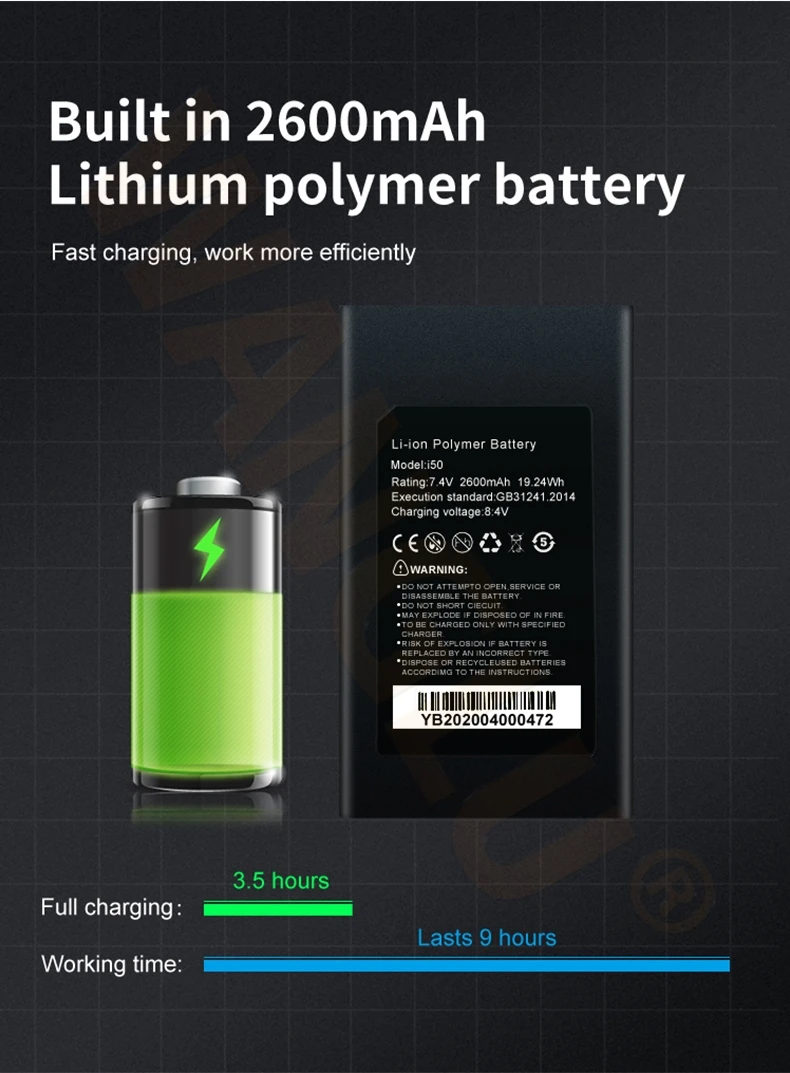 ● 7.4 V /2400mAh Lithium Ion Polymer Battery, after 4~5 hours charging, working time lasts 7 hours