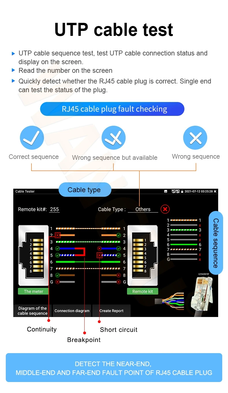 ●Improvement cable tester, UTP cable, telephone cable etc order and connectivity test, can save testing report, if special number, need customized