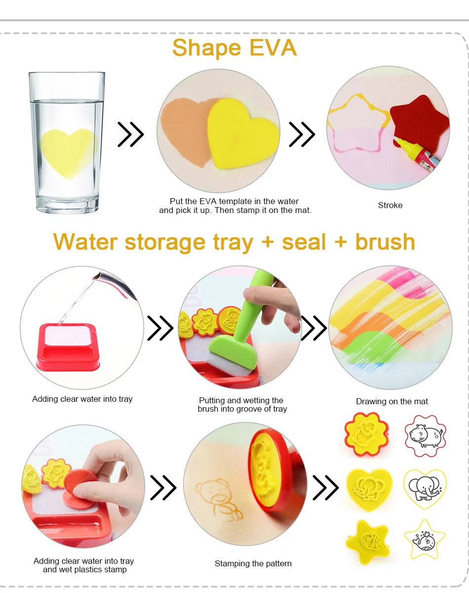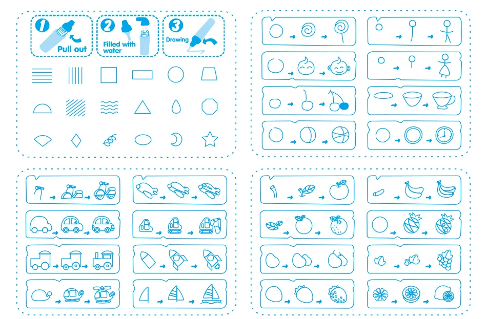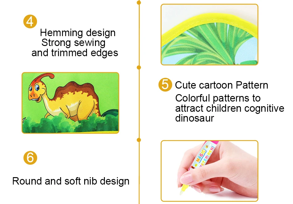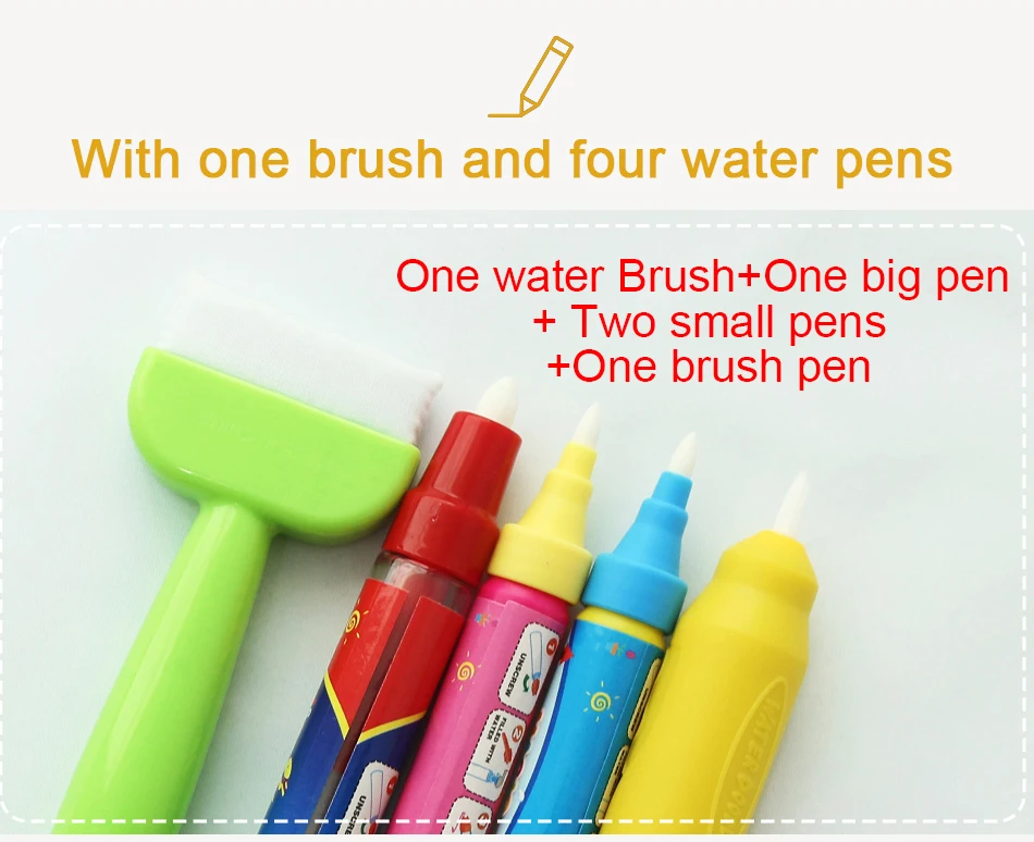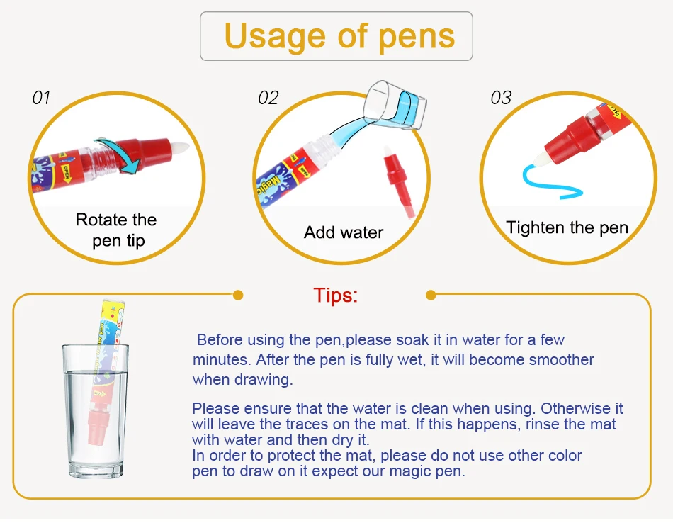 1. Многоразовые: ручка для воды добавьте воду, не используйте чернила. Когда вы держите ручку для воды на коврике, окрашенной с рисунком, пожалуйста, подождите 5-6 минут, вы можете повторить это