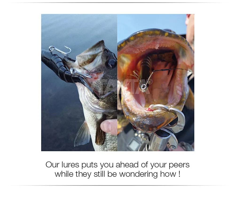 Оставайтесь впереди и сохраняйте положительный энтузиазм, вы можете иметь его, наслаждайтесь вашим счастливым временем! Информация о продукте: Тип приманки: 8-слойные Многослойные искусственные рыболовные приманки с 2 тройными крючками, s-плавное движение на любой скорости Вес приманки: 27 г Длина приманки: 13,8 см 1) приманка для ловли щуки/окуня-реалистичные глаза и тело 3D делают ее настоящей рыбой. 2) мульти Соединенное тело-части тела соединяются с текстильной тканью позволяет этой приманке перемещаться в сторону, как настоящая рыба будет плавать. 3) искусственная твердая приманка для плавания-многоразовая Защита окружающей среды большие губки для рта. Различные цвета и узоры, чтобы соответствовать любой рыболовная среда. 4) Встроенный гравитационный шар-Поднимите расстояние броска, производите звук, привлекающий больших хищников. Обтекаемый дизайн уменьшает сопротивление ветра во время бросания. 5) замечательные рыболовные аксессуары для любителей рыбалки. Отлично подходит для ловли басов, желтых окуня, щуки, мускулов, карпа, рыбаков, форели и т. д. Особенности: * Материал ABS снаружи, который является avirulent и без запаха, экологически чистый. * Металлический материал внутри, который имеет большой эффект гравитации. * Подходит для различных аквапарков. * Он создает подлинные плавательные действия в воде и притягивает хищника к укусам. * Красочные приманки для больших ударов. * Они создают жизнь, как плавательные действия в воде. * 3D глаза выглядят так же реалистично, как естественные живые приманки. * Подходит для разных цветов, размеров и ловли разных рыб.