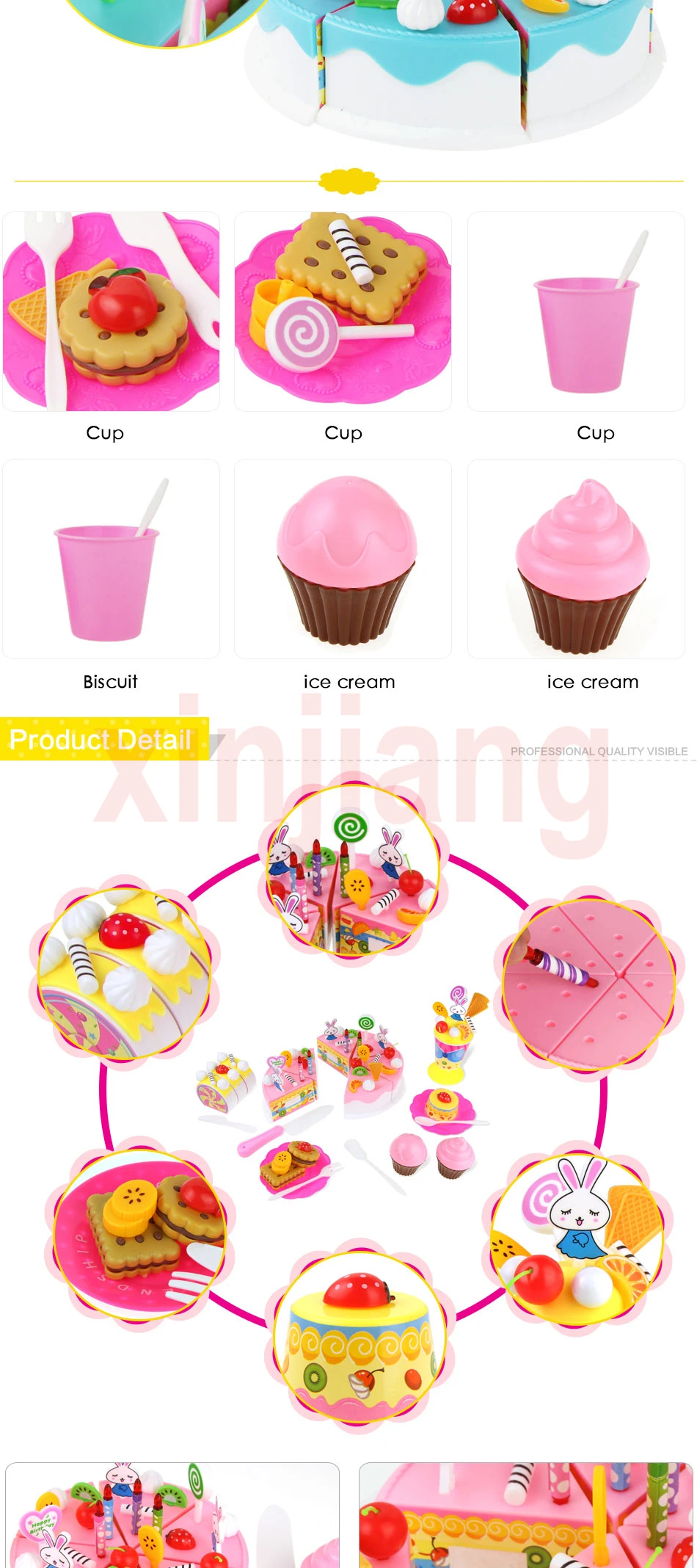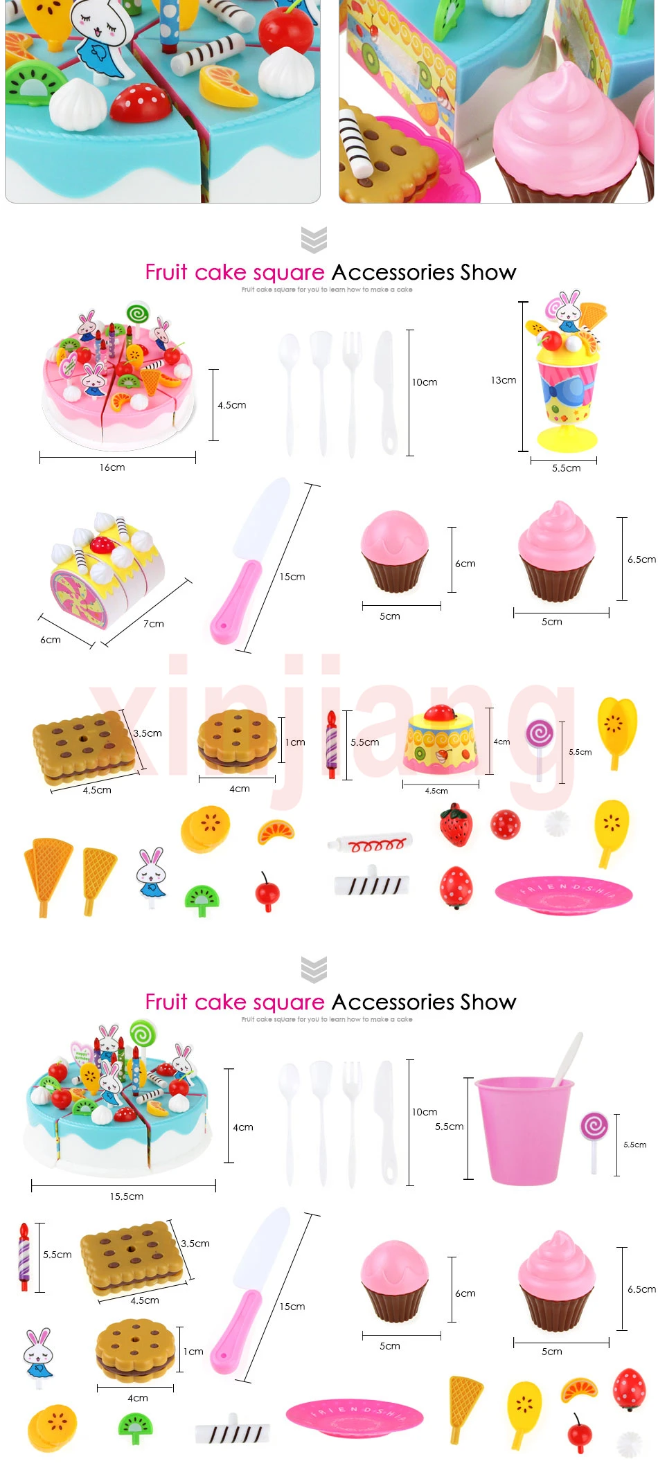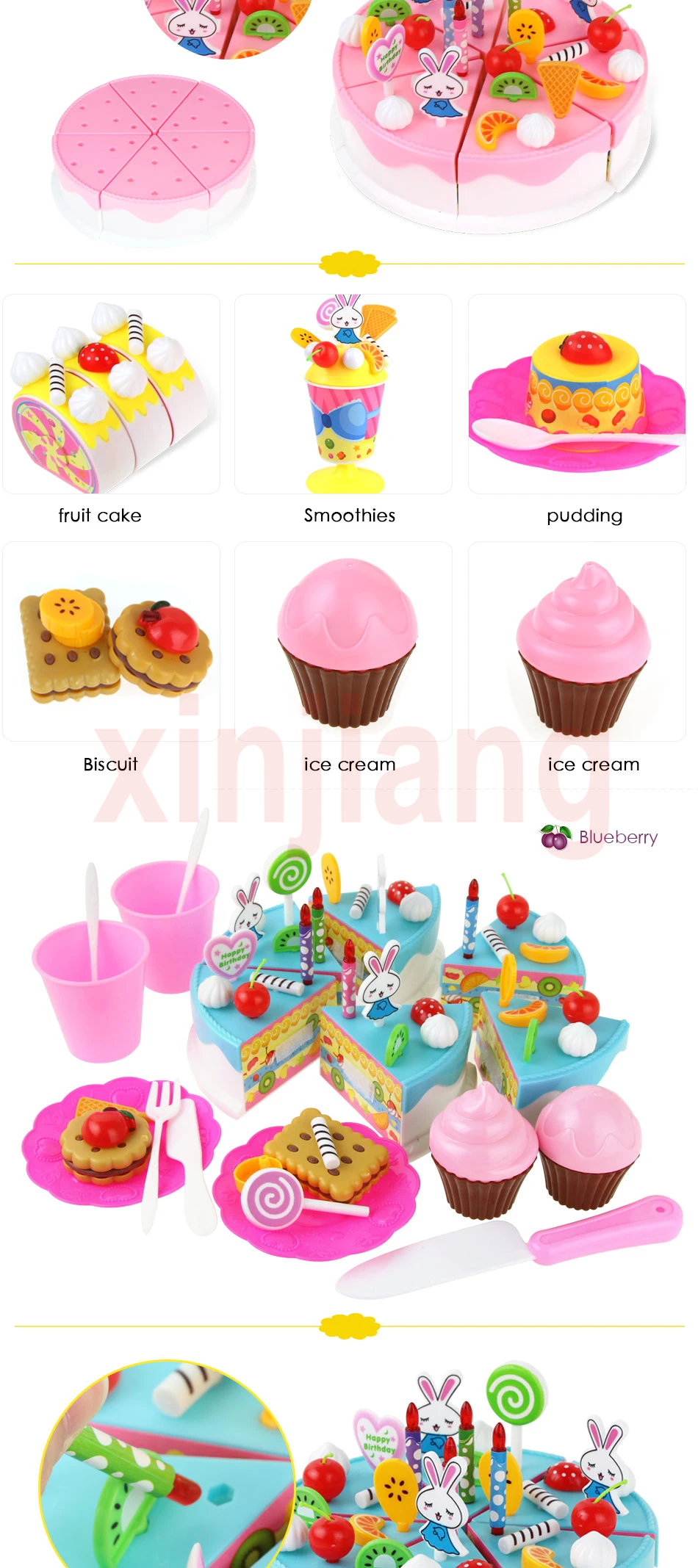 -Поставляется с пластиковым ножом для детей, чтобы разрезать торт. -Изготовлен из экологически чистого пластика, не вредит детям. -Дети могут нарезать торт на куски, которые прилипают вместе с липучкой, а затем приспосабливать их обратно. -Торт оснащен различными аксессуарами, дети могут DIY свой собственный торт ко дню рождения. -Дети могут играть в ролевые игры с помощью DIY тортов, которые помогут им запоминать названия продуктов питания и развивать навыки подсчета