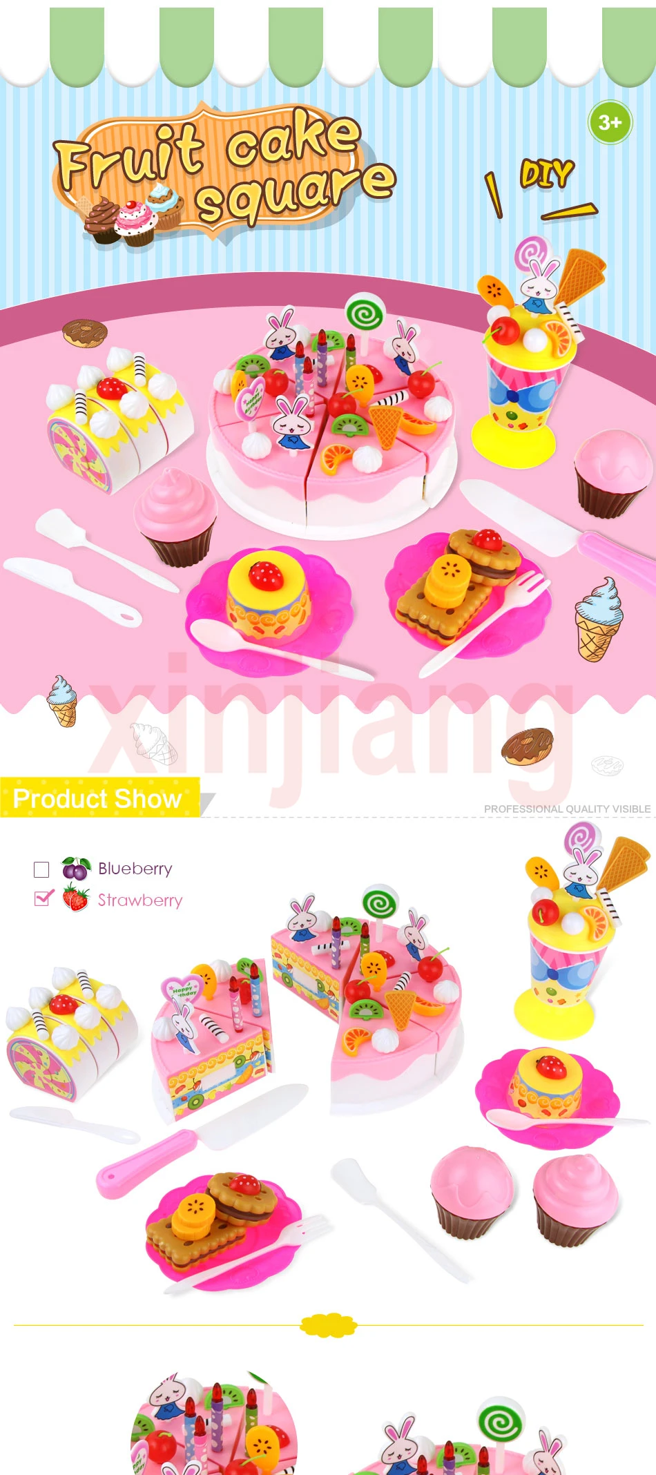 1x70 шт фруктовый торт набор игрушек Розовый комплект: 6 * торт 2 * маленький торт 1 * мороженое 1 * пудинг 3 * омлет торт 2 * печенье 48 * гарнир (аксессуары для омлета, аксессуары для торта) 7 * аксессуары для инструментов (нож и вилка, чашки и блюдца) Синий комплект: 6 * торт 1 * маленький торт 1 * мороженое 2 * чашка 2 * пластина 2 * печенье 2 * леденец 49 * гарнир (аксессуары для омлета, аксессуары для торта) 5 * аксессуары для инструментов (нож, вилка, ложка)
