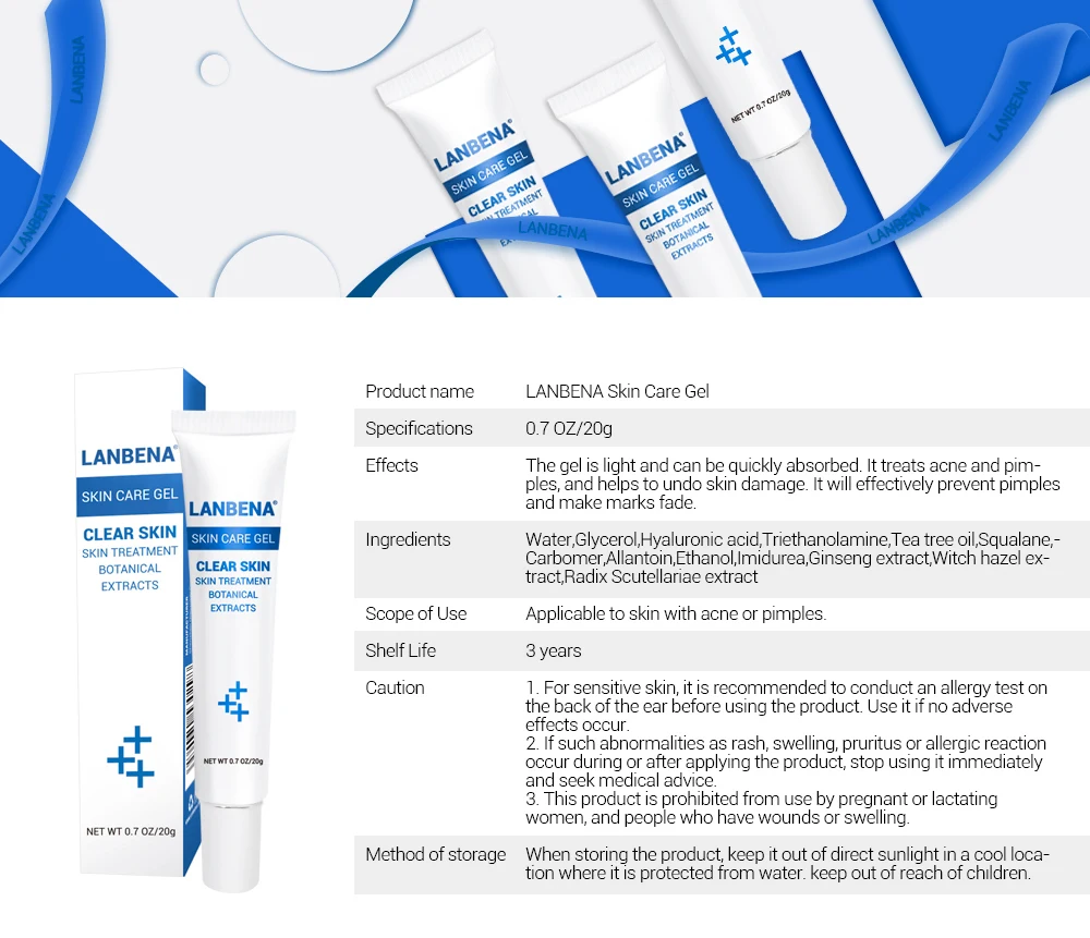 Название продукта: гель для ухода за кожей LANBENA Технические характеристики: 0,7 OZ/20g Эффект: гель-светильник, который быстро впитывается. Он лечит акне и прыщи, помогает снять повреждения кожи. Это эффективно защищает от прыщей и выцветания следов. Состав: вода, глицерин, гиалуроновая кислота, триэтаноламин, масло чайного дерева, Squalanef-Carbomer, аллантоин, этанол, имитиреа, экстракт женьшеня Область применения: подходит для кожи с акне или прыщами. Срок годности: 3 года Внимание: 1. Для чувствительной кожи перед использованием изделия рекомендуется провести тест на аллергию на задней стороне ушного раковины. Используйте его, если не произошло отрицательных эффектов. 2. Если такие аномалии, как сыпь, отеки, зуда или аллергическая реакции, имеют место во время или после применения продукта, прекратите его использование немедленно и обратитесь за медицинской помощью. 3. Этот продукт запрещен для использования беременными или кормящими женщинам, а также людям с ранами или отеками. Способ хранения при хранении продукта, держите его подальше от прямых солнечных лучей в прохладном месте, где он защищен от воды, Хранить в недоступном для детей месте.