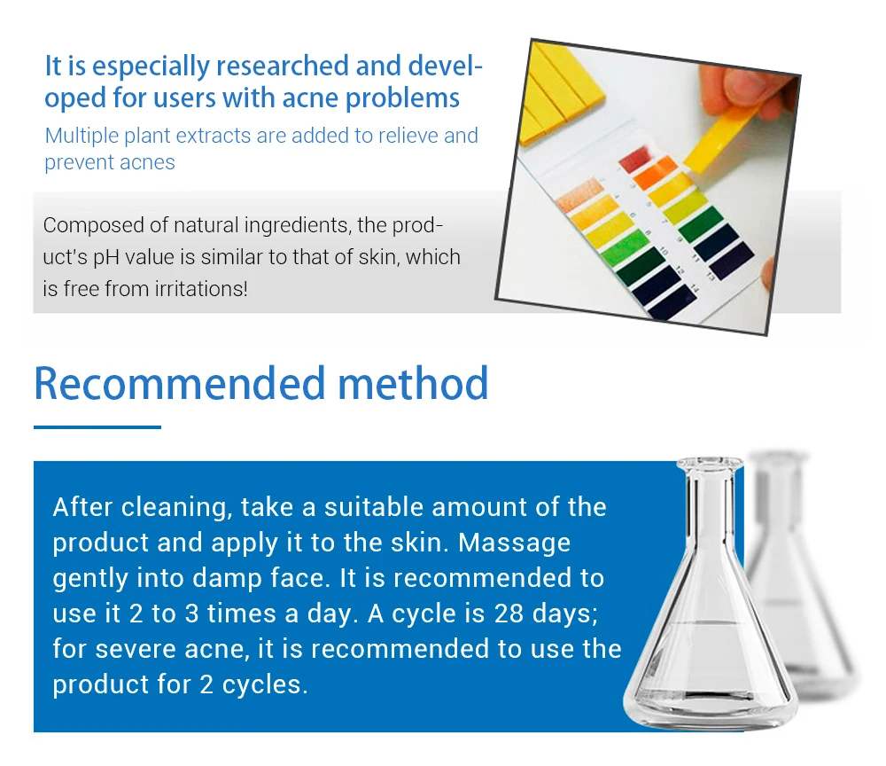 Мягкая формула Травяной scne обработки Лечение акне, контроль жирности масла Баланс влаги и масла, не оставляя шрамов или пятен Отверждающая и питающая кожу Эта формула не раздражает кожу при угревой сыпи. Интенсивный Восстанавливающий Восстанавливает кожу, достигая дна кожи.
