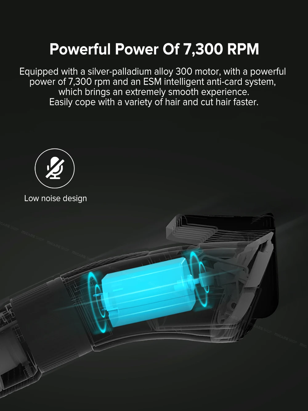 Оснащенный мотором 300 из серебристо-палладиевого сплава, с мощной мощностью 7300 об/мин и интеллектуальной системой ESM с защитой от карты, что обеспечивает чрезвычайно гладкий опыт. Легко справляется с разнообразными волосами и быстрее стригает волосы.