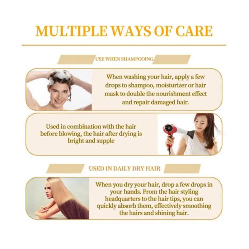 При мытье волос нанесите несколько капель на шампунь, увлажняющую маску или маску для волос, чтобы Двойной питательный эффект и восстановить поврежденные волосы.