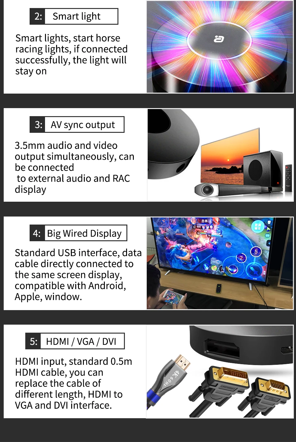Описание 1. Как первый WIFI + Проводной Двойной вход, HDMI + AV двухвыходная версия зеркального отображения нескольких устройств, отверстие AV используется не только как метод вывода видео, но также можно использовать для подключения динамиков и создания домашнего кинотеатра. 2. HP525-это высокопроизводительный процессор с низкой мощностью. Принятие RK3229 Quad-core Cortex-A7 с тактовой частотой 1,5 ГГц чип, высокую скорость обработки, лучшего качества продукции, и вы можете панель расшифровки жидкокристаллического дисплея 4K H265 формат видео. 3. Беспроводной дисплей поддерживает зеркальное отображение и Потоковую передачу ваших мобильных устройств на телевизор/проектор или любой HDMI/VGA/DVI дисплей беспроводной ly. Превратите hd-телевизор в смарт-телевизор, используйте мобильные устройства в качестве контроллера. Проводной Дисплей: usb-кабель для передачи данных отражает и передает ваше мобильное устройство к телевизору/проектору или любому монитору HDMI / VGA/DVI. Содержимое маленького экрана сливается в большой экран, игра более прохладная и быстрая. 4. Хорошая совместимость: работает со смартфонами и планшетами (для Samsung, для Sony, для iPhone и т. д.) с Android 4,4 или выше и для iOS 8,0 или выше. Совместимость с Windows 7/8/10 и более поздними версиями с встроенными возможностями Miracast. 5. Поддержка обновлений OTA: через облачный сервер мы будем регулярно обновлять прошивку для улучшения совместимости, добавлять новые функции и исправлять ошибки. Обновите этот ключ онлайн автоматически, когда мы выпустим новую версию, чтобы он был совместим с новейшей версией вашего устройства. 6. Поддержка ed для большинства приложений. Поддержка онлайн-игр и локального воспроизведения, видео развлечений по всей сети, Youku, Sohu, Tencent и другого воспроизведения видео, что позволяет воображать на большом экране массовые интернет-ресурсы. Не совместим с приложениями, которые имеют защиту авторских прав на видео HDCP, например, для Netflix, для Amazon video, для SKYGO, для HBO go, для HULU и для Honda motor. Потому что эти приложения зашифрованы и не авторизованы для третьего вечерние обмена программным обеспечением. Характеристики (HP510, HP512) Процессор: RK3036 Linux OS Qual-Core (2,4G с RK3066) Процессор: двухъядерным процессором core A7 Процессор, 1,0 ГГц Графический процессор: ARM Mali-400 GPU. Поддержка 4K VP9 и 4K 1bitsH26 5/H264 декодирование видео, до 60 кадров в секунду. Мультимедиа: 1080P H.265/H.264/VC-1/MPEG/VP8 видео декодер. Дисплей: HDMI 1,4 передатчик с HDCP 1,2, CVBS выход. Посылка: BGA236 12 мм x 12 мм. Соглашение с тем же экраном: Anycast, Ezcast, DLNA, Miracast, Airplay Поддержка системы: IOS, MAC, ANDROID, WINDOWS Поддержка содержимого: видео, аудио, фотографии, документы, онлайн-видео, Вход: WIFI, USB женский Выход: HDMI Женский, AV DC: 1 * Micro USB порт Возможность декодирования: 1080P H.265/H.264/VC-1/MPEG/VP8 видео декодер Wifi карта микросхем: 2,4G с RK3066 + 8188FTV, 5G с RK3036 + 8821CU Характеристики (HP520, HP525) Процессор: Новый RK3229 Quad-core Cortex-A7 с тактовой частотой 1,5 ГГц GPU: Mali400MP, поддержка OpenGLES1.1/2,0, поддержка 4K VP9 и 4K 1 бит H265/H264 декодирование видео, до 60fps Мультимедиа: 1080P многоформатное видео декодирование (WMV, MPEG-12/4, VP8) 1080P Кодирование видео: H.265/H.264/VC-1/MPEG/VP8 формат Дисплей: HDMI 2,0 поддерживает дисплей 4K 60Hz, Поддержка HDCP 1,4/2,2 CVBS выход Посылка: BGA316 14X14, шаг 0,65 мм Соглашение с тем же экраном: Anycast, Ezcast, DLNA, Miracast, Airplay Поддержка системы: IOS, MAC, ANDROID, WINDOWS Поддержка содержимого: видео, аудио, фотографии, документы, онлайн-видео, Вход: WIFI Выход: HDMI DC: 1 * Micro USB порт Wifi карта микросхем: 2,4G с RK3229 + 