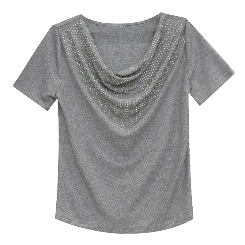 Летняя однотонная футболка, женская повседневная хлопковая футболка с коротким рукавом, шикарные женские топы с бриллиантами, женская мода 2020, новая S-3XL, T04714B