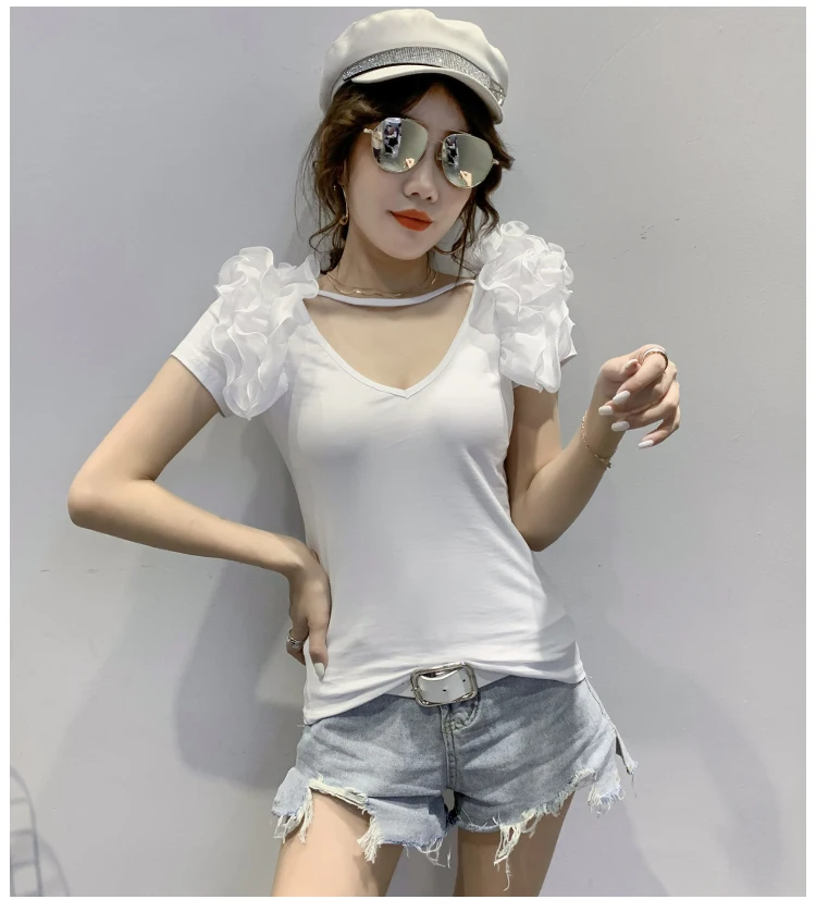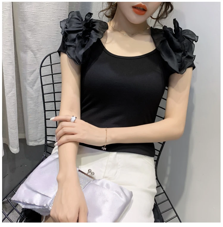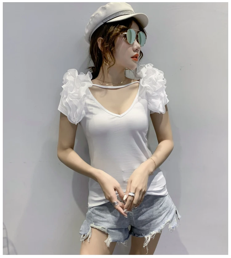 Женская Однотонная футболка с оборками, Повседневная футболка с коротким рукавом в Корейском стиле, простая хлопковая футболка, модель T04717B, лето 2020