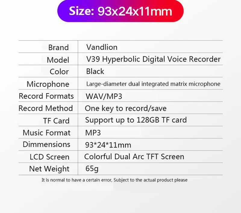 1. Формат записи: WAV/MP3 2. Формат воспроизведения музыки: WMA/WAV/MP3/OGG и т. д. 3. Время записи батареи: около 25 часов 4. Время работы аккумулятора: около 15 часов 5. Аккумулятор: литиевая батарея 230 мА · ч, время зарядки аккумулятора: около 3 часов 6. Разрешение ЖК-дисплея: точечный экран 80*160 7. Интерфейс USB: высокоскоростной USB 2,0 8. Встроенный динамик: 18 мм * 26 мм 8 Омега/1 Вт 9. Рабочая температура: от 0 до 40 градусов 10. Запись частоты дискретизации: 48 кГц 11. Разъем для наушников: 3,5 мм, двойной трек 12. Шум-сигнал соотношение: 80db 13. Размер (мм): 95*24*11 (Д * Ш * Т) 14. Вес нетто: 36 г 15. Совместимая система: Windows 2000 и выше