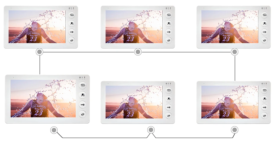 Система поддерживает до 6 мониторов, 2 Дверных звонка, 2 камеры видеонаблюдения и 2 датчика сигнализации. (не входит в комплект)