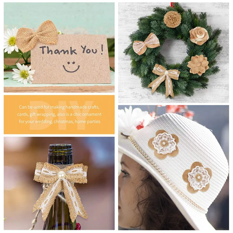 Широкое применение: мешковина с цветами и бантами ручной работы и плоская на спине, легко приклеивается, подходит для винтажный головной убор, заколки для волос, шляпы, броши, приглашения в деревенском стиле, поздравительные открытки, подарочная упаковка, альбом для скрапбукинга; Также может быть применен во многих случаях, таких как деревенская свадьба, Рождество, Вечерние украшения для дома