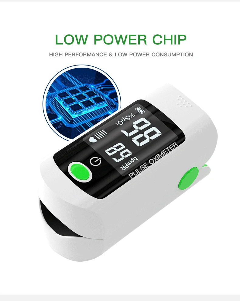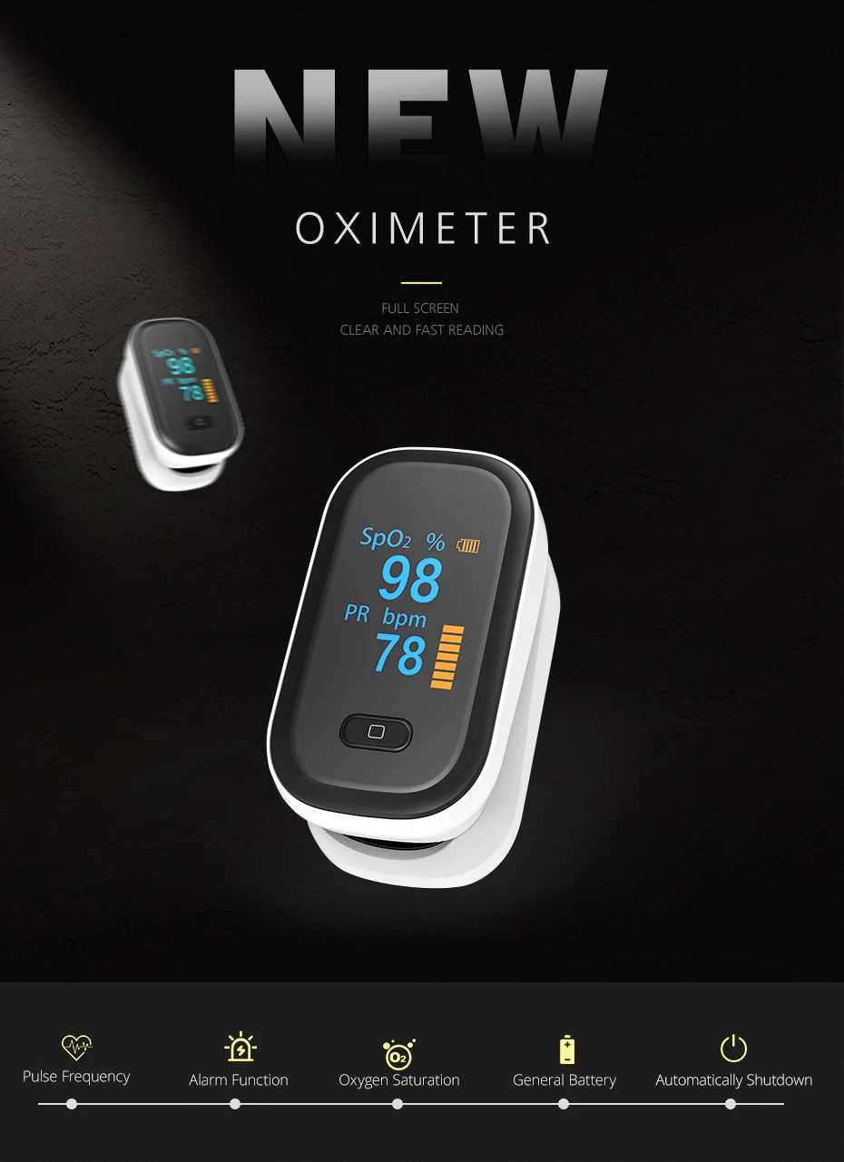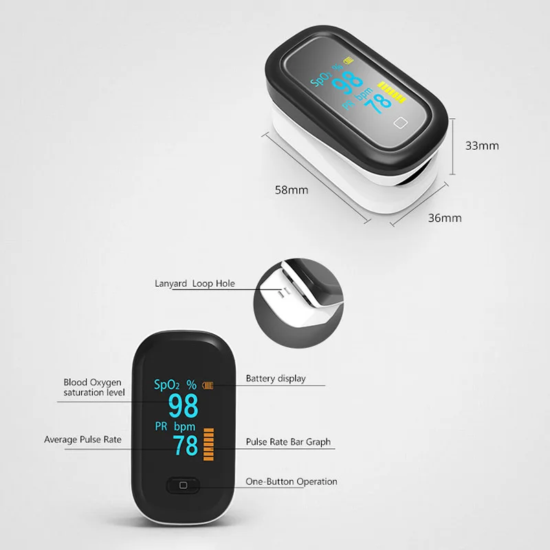 Пульсоксиметр на кончик пальца может точно определить уровень насыщения крови кислородом и PR (Частота пульса) после клинических и профессиональных тестов, быстрые показания SpO2, измерения пульса и его удобно отображать на большом цифровом ярком OLED-дисплее.