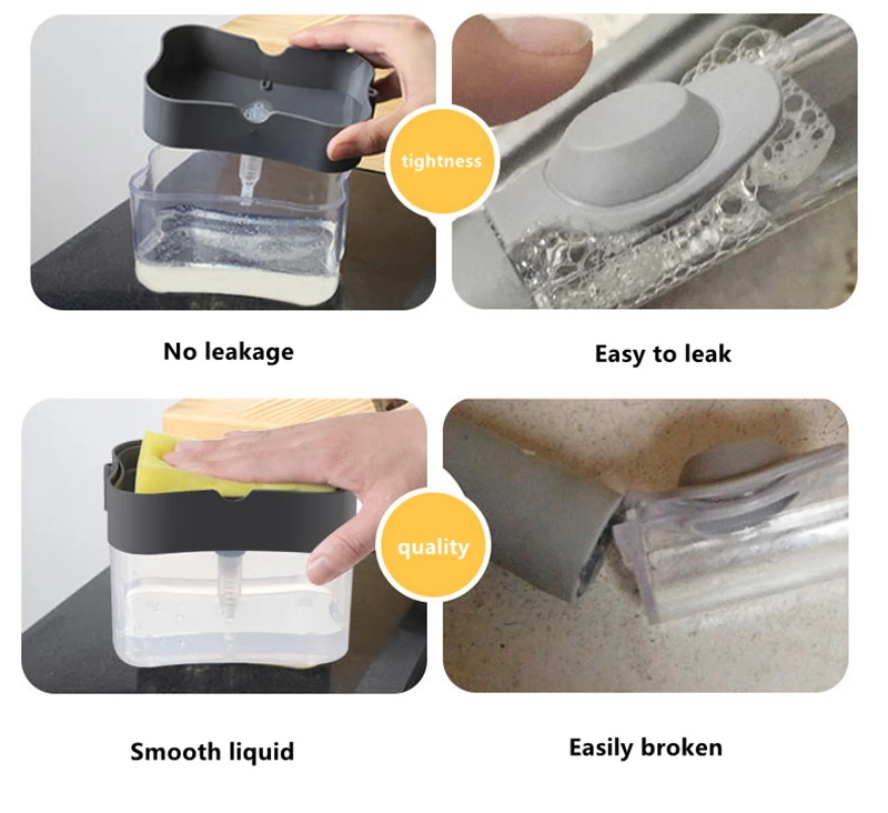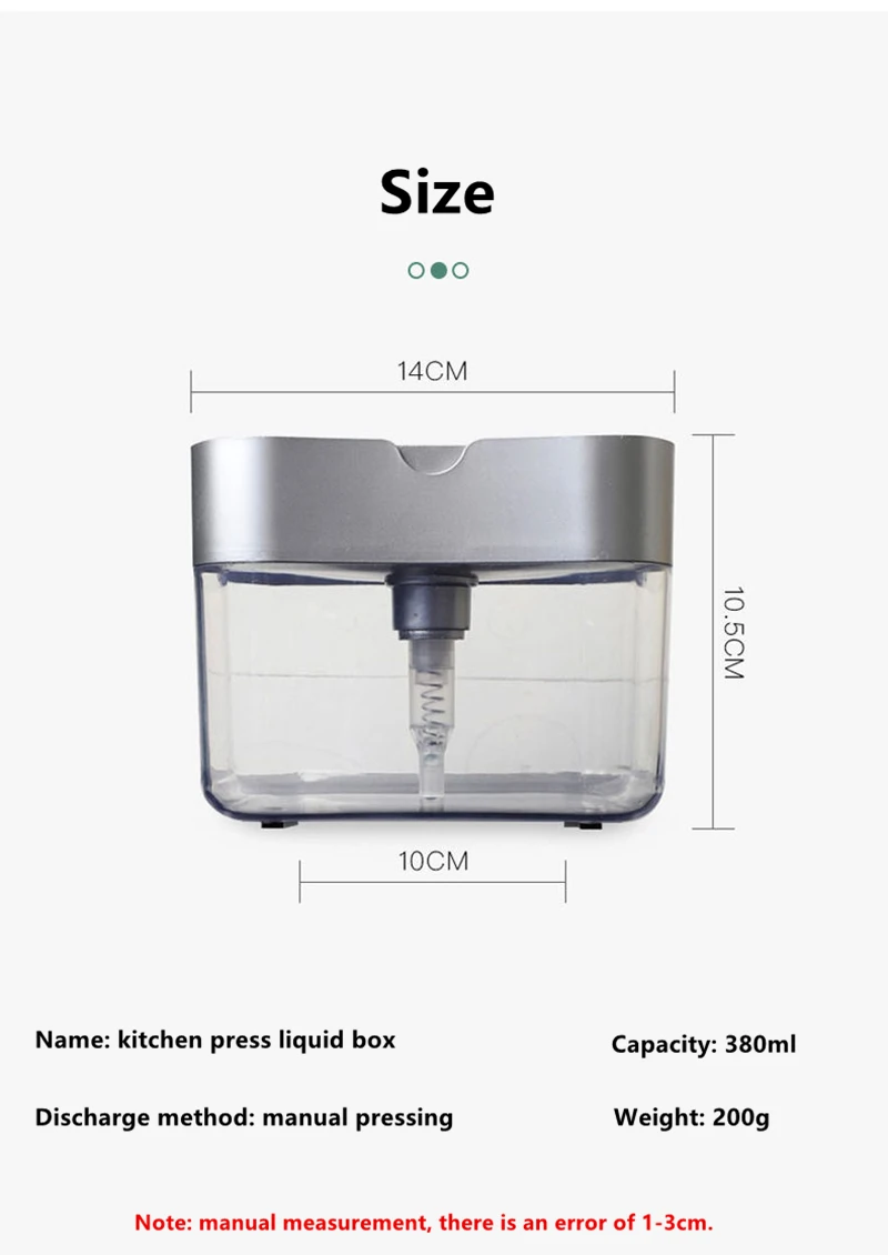 Продукт: дозатор для мыла Цвет: серый/серебристый Материал: ABS Размер: 14 см * 10,5 см Использование для: уборки кухни Посылка включает: 1 диспенсер для мыла с 1 губкой Или 1 диспенсер для мыла с 2 губками В отличие от других традиционных диспенсеров, этот дозатор мыла 2-в-1 для посудомоечной машины предназначен для превосходного качества, изготовлен из небьющегося АБС-пластика, что позволяет на long-lasting.No больше хвататься за мыльную бутылку. С ним также будет работать любая другая губка или скребок! Распределите идеальное количество мыла на губку, чрезвычайно проста в использовании. Работает со всеми видами жидкого мыла. Наполните его 13 унций вашего любимого мыла для посуды, затем используйте входящую в комплект губку, чтобы надавить на насос, который распределяет идеальное количество мыла для посуды на губку. Этот дозатор для мытья посуды полностью преобразит вашу кухонную жизнь, предназначен для быстрого мытья посуды, мгновенная работа сэкономит ваше время, а 1 ручная работа позволит сохранить ваш уровень энергии всегда высоким.
