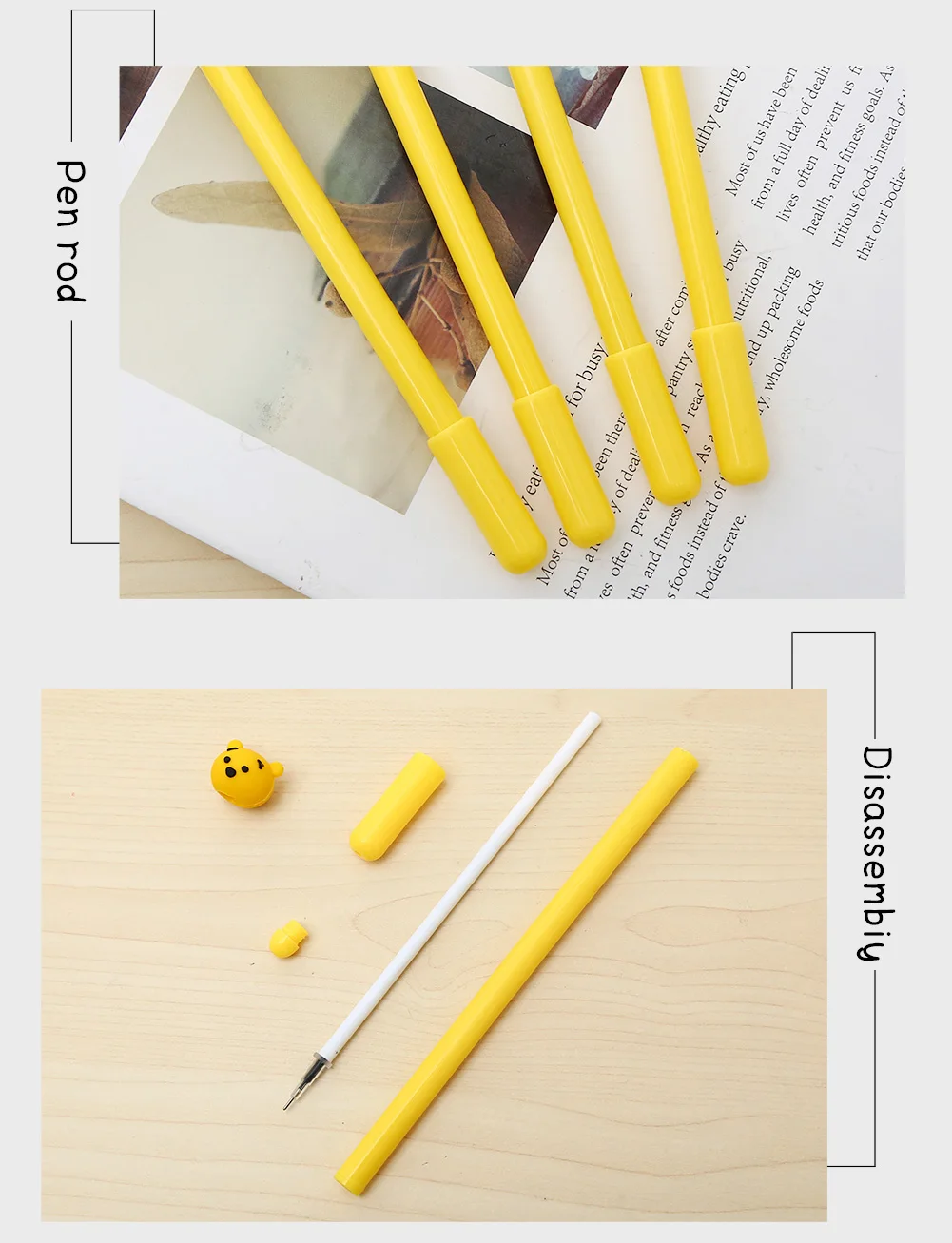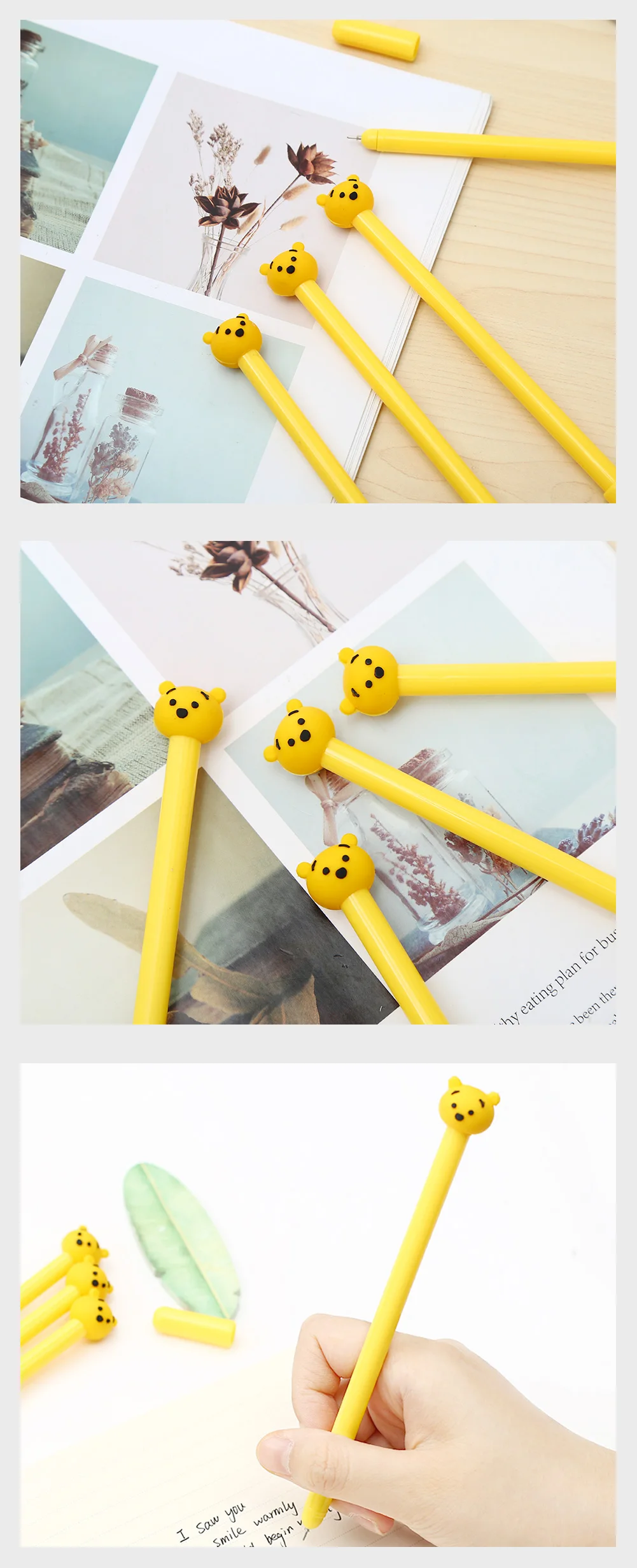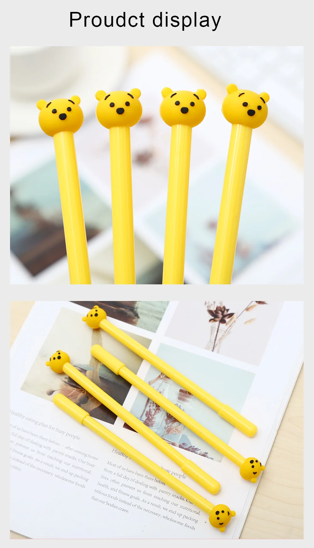 1, Style: Honey Bear Pooh Promotional Creative Kawaii Cute Anime Talent Gel Pen 2, Material: Plastic, Rubber Pens 3, Specification: Weight:9g Length: 16cm Ink: Black or blue for you to choose. 4, Feature: Adult Teacher Nurse Student Kids Smooth Writing Daily Use Pen 5, Function: Office Business Signature Tool School Student Exam Stationary 6, Custom: Yes, Logo is_Customized with MOQ, Accept PS(Photoshop), AI(Adobe Illustrator), CD(CorelDraw) format