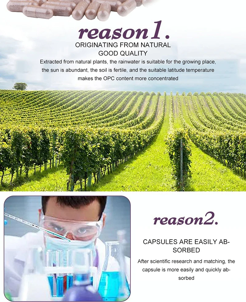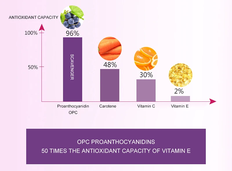 Экстракты виноградных косточек богаты множеством полезных веществ из цельных виноградных косточек с большой концентрацией витамина Е, флавоноидов, линолевой кислоты и OPC (олигомерные процианидины), которые с сильными антиоксидантными свойствами помогают защитить клетки от свободных радикальных повреждений. Они также поддерживают целостность и здоровье кровеносных сосудов, вен, глаз и поддерживают здоровую соединительную ткань и кожу путем поощрения коллагена и синтеза эластина в матрице кожи.