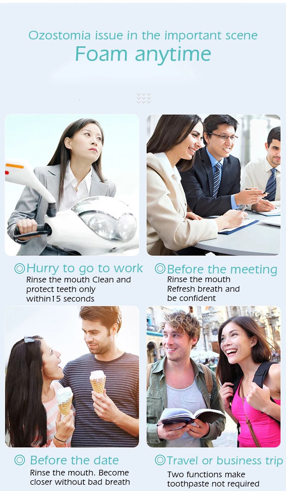 01. Вдавливайте необходимое количество пены в рот, Надавливайте на щеки, чтобы пена текла через полость рта и гингиву; выплюните пену за 10-15 секунд, и вы почувствуете, что ваш рот мгновенно обновится