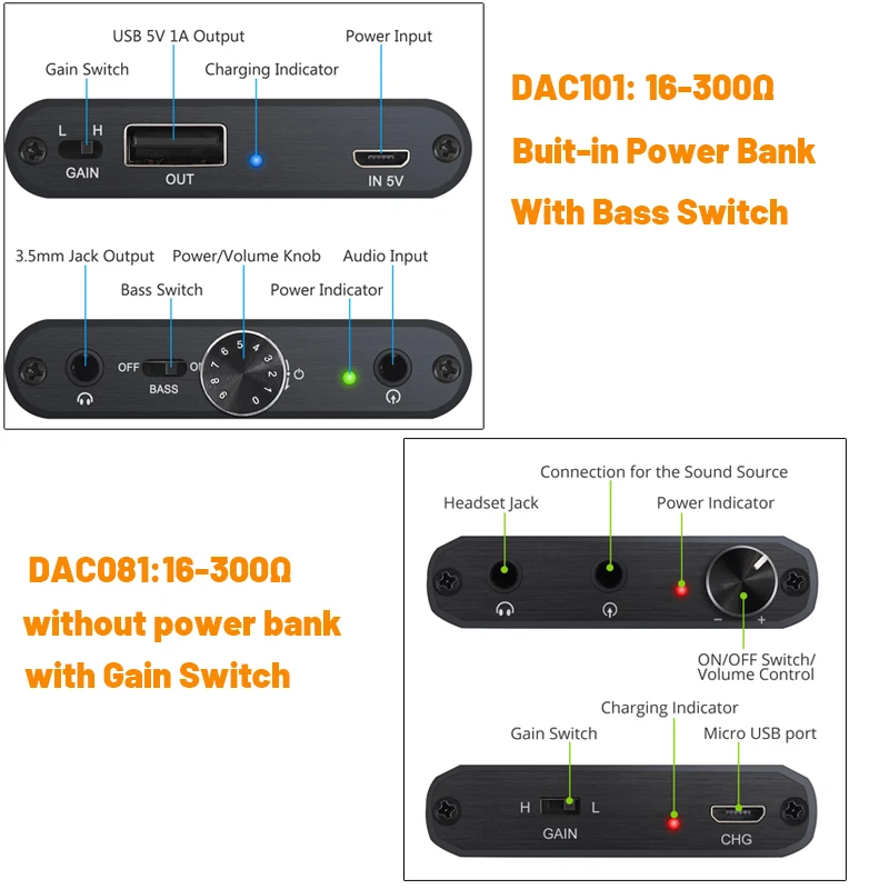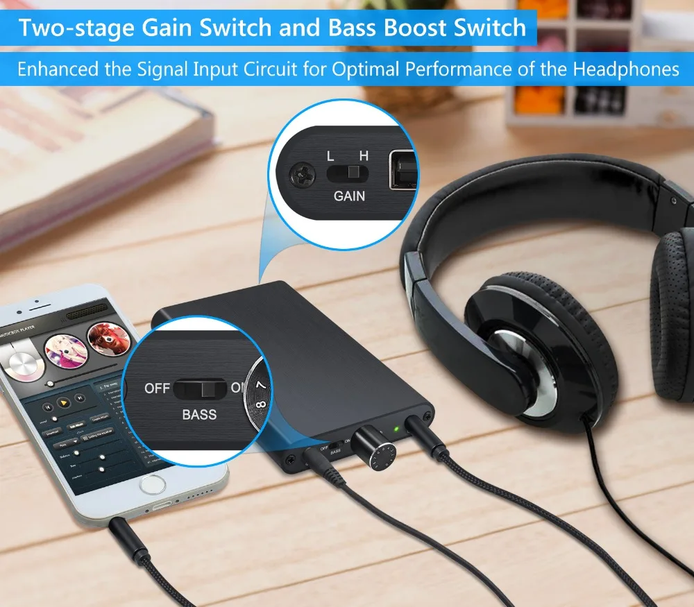 3. Переключатель высокого/низкого усиления и усиление басов для оптимальной производительности наушников.