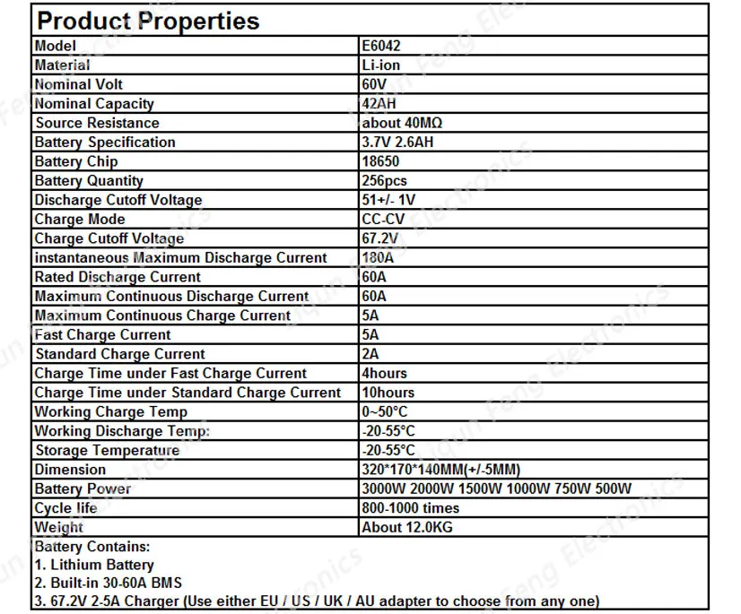Подходящая мощность аккумулятора двигателя 250 Вт 350 Вт 450 Вт 500 Вт 650 Вт 750 Вт 800 Вт 1000 Вт 1500 Вт 2000 Вт 2500 Вт 3000 Вт (пожалуйста, укажите мощность двигателя перед покупкой. Спасибо!)Хранить в хранилище -Для поддержания емкости аккумулятора рекомендуется хранить аккумулятор и Аккумуляторный блок при-20 ~ 35, низкой влажности и отсутствии агрессивного газа. -Батареи следует хранить при высокой температуре или высокой влажности, в противном случае это приведет к протечке батареи, ржавчине и ёмкости ниже. -Длительное хранение приведет к снижению емкости аккумулятора и аккумуляторного блока, а максимальная емкость разряда может быть достигнута после того, как требуется цикл зарядки/разрядки 1-3. -Через три месяца аккумулятор должен быть заряжен и разряжен. Предупреждение: -Не допускайте обратной зарядки, аккумулятор должен быть в соответствии с полярностью правильного подключения, а не в обратном направлении. -Не допускайте короткого замыкания, иначе это приведет к постоянным повреждениям. -Аккумулятор нельзя использовать в экстремальных условиях, таких как: предельная температура, глубина цикла, крайняя перезарядка и разрядка. -Храните аккумуляторы в сухом прохладном месте, если хранится или отправляется большое количество батарей. -Не припой напрямую к батарее. -Если батарея шумная, высокая температура, утечка и другие ненормальные ситуации, пожалуйста, прекратите использование. -Не сажайте в огонь и не пытайтесь разобрать, аккумулятор может сгореть или вызвать вредные вещества. -Не позволяйте использовать старую или половину аккумулятора с новой батареей, иначе он вызовет разряд. -Не отрезайте корпус и не снимайте трубку кожуха аккумулятора. -Не допускайте попадания аккумулятора в воду. Примечание: -Аккумулятор необходимо зарядить перед использованием. -Способ зарядки в соответствии с нашими техническими характеристиками. -Используйте зарядное устройство для зарядки. -Аккумулятор следует избегать при использовании герметизации, должен обеспечить соответствующее вентиляционное устройство, в противном случае батарея может вырабатывать водород, в чехол точки воспламенения вызовет взрыв. -Не пытайтесь разделить батарею или выдержать выдавливание и столкновения, это может привести к повышению температуры батареи, ярости, разлитый щелочной электролит повредит кожу, а глаза также могут съесть одежду. -При проглатывании Аккумулятор следует держать подальше от ребенка, немедленно обратитесь к врачу. Когда аккумулятор не используется, его следует вынуть из оборудования. -При первом использовании новой батареи или длительном хранении, используйте электричество раньше. -Не прикасайтесь к батарее, когда она нагревается, пока она не остынет. -Когда аккумулятор используется, устройство следует выключить, когда энергия используется, чтобы избежать чрезмерной разрядки. -Вытащите аккумулятор, он должен удерживать клемму аккумулятора и не должен удерживать провод. -После использования батареи, если батарея нагрелась, ее можно поместить в место, где воздух не находится непосредственно в месте вентиляции и нет прямых солнечных лучей.