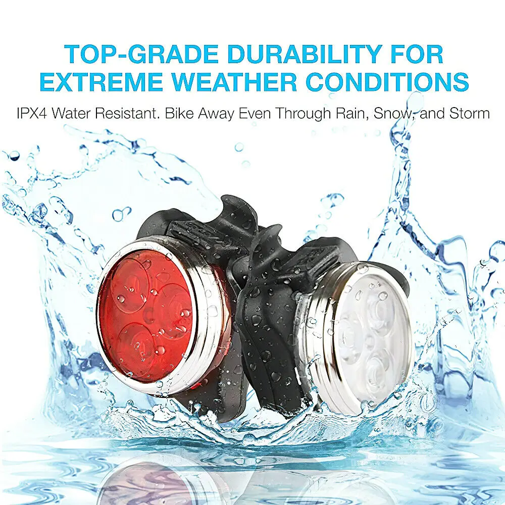 Тип изделия: велосипедный светильник, светильник с передней задней головкой Цвет: красный, белый. Материал: алюминиевый сплав, пластик. Размер: около 4,5*4,5 см/1,77*1,77 дюйма (Д * Ш). Характеристики: 4 режима на светильник: Полная яркость, половина яркости, медленное мигание, быстрое мигание. Время полной зарядки. Главный светильник: 3,5 часа (полная яркость), 10 часов (половина яркости), 10 часов (медленное мигание), 10 часов (быстрое мигание). Задний светильник: 2,5 часа (полная яркость), 9 часов (половина яркости), 9 часов (медленное мигание), 9 часов (быстрое мигание). Аккумулятор: 650 мАч перезаряжаемая литиевая батарея. Водонепроницаемость: IPX4 Перезаряжаемый светильник USB, встроенный литиевый аккумулятор 650 мАч для каждого светильник. Без замены аккумулятора. Фара и задний фонарь имеют 4 режима: полную яркость, половину яркости, быстрое мигание и медленное мигание, переключает его по мере необходимости Усовершенствованный силиконовый монтажный ремешок. Ремешок достаточно эластичный, чтобы соответствовать всем видам велосипедов и может быть установлен на любой части велосипеда Простая установка. Ремешок может быть легко ослаблен и застегнут, и никаких инструментов не требуется. Безопасная езда. Руководствуйтесь фарой и не беспокойтесь о том, что их сбивают другие с заднего фонаря.