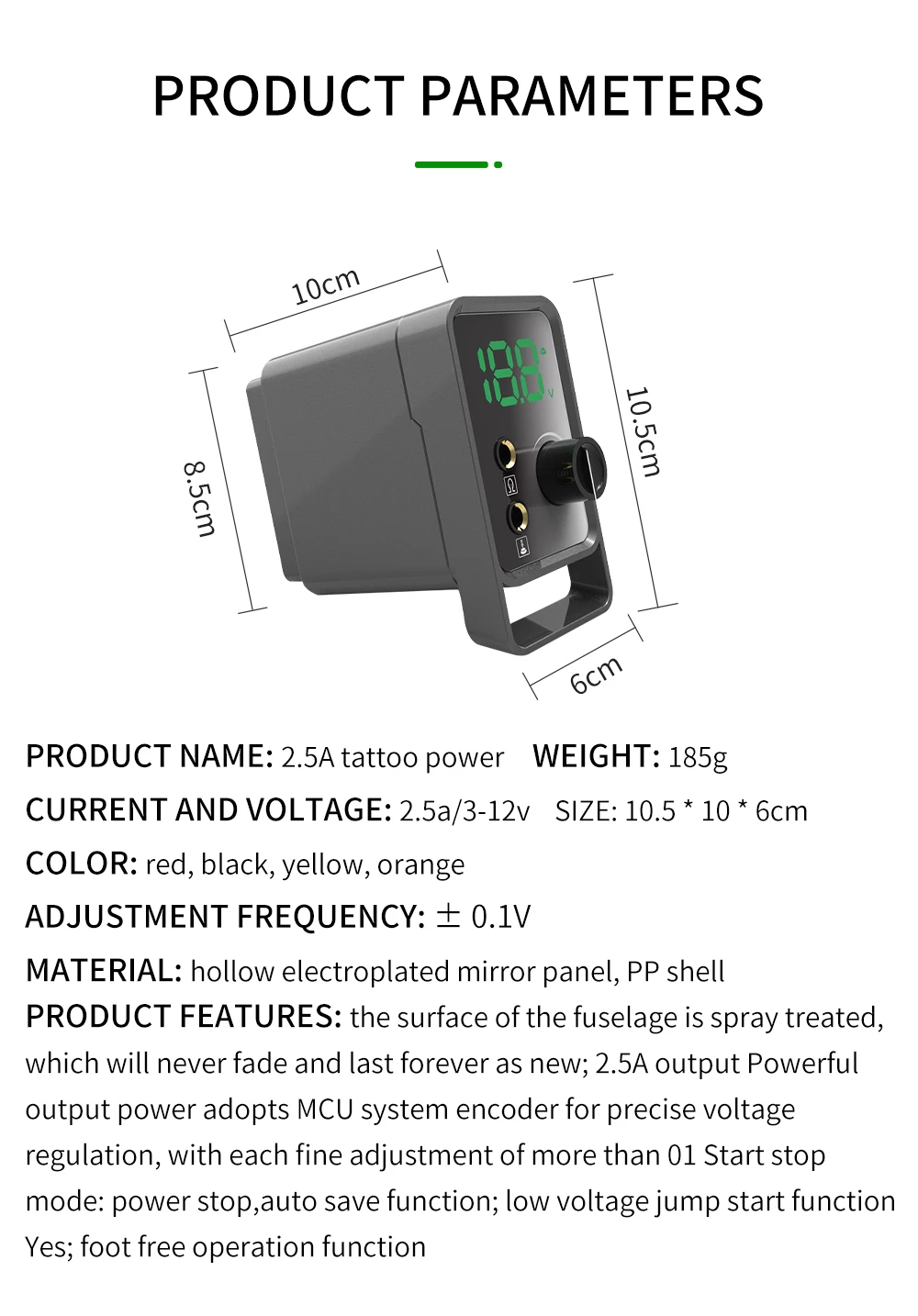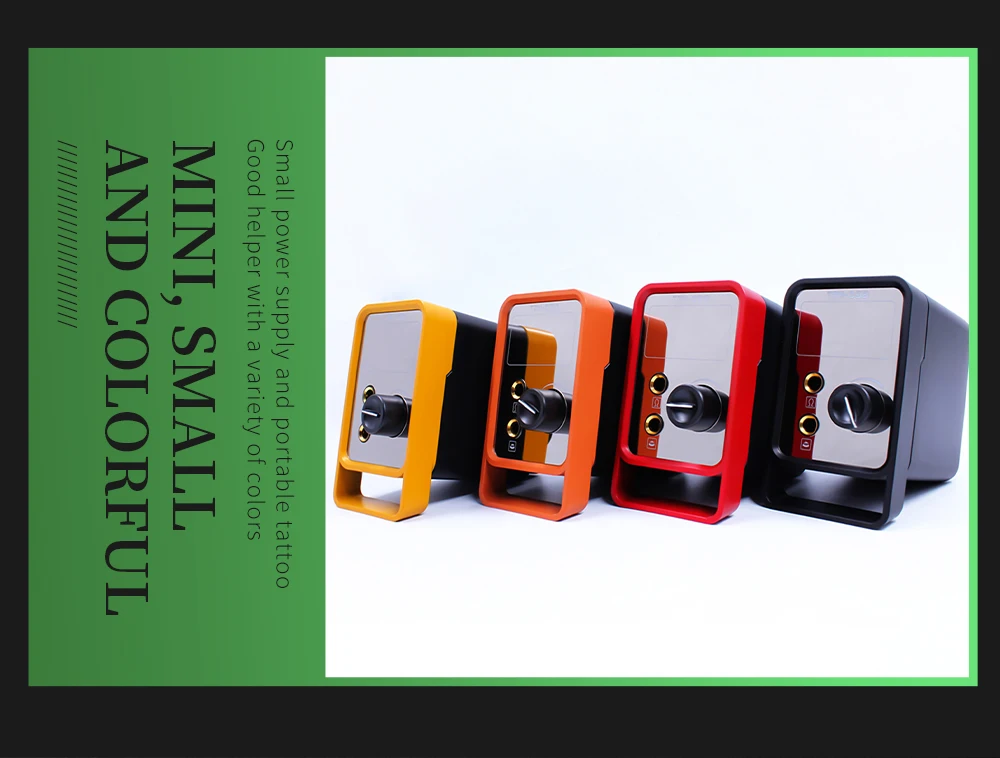 Название продукта: мощность татуировки 2.5A Ток и напряжение: 2.5A/3-12 В Цвет: красный, черный, желтый, оранжевый Материал: пустотелая гальванизированная зеркальная панель, полипропиленовая оболочка Использование: для комплектов тату-машин Размеры: 10,5*10*6 см