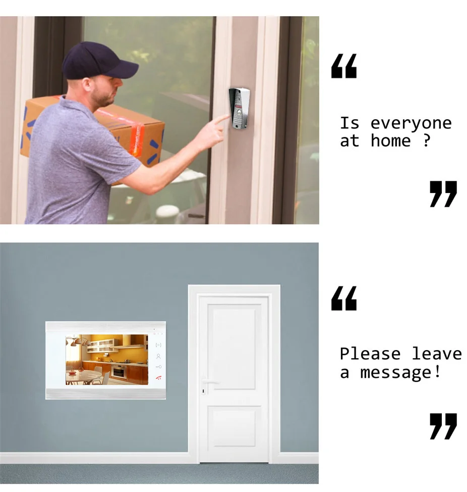 Он может установить режим сообщений, когда вы находитесь снаружи, поэтому, когда посетители приходят, панель вызова может автоматически говорить: «Пожалуйста, оставьте сообщение» после 30-120s звонка. Затем мастер может найти запись в файле.