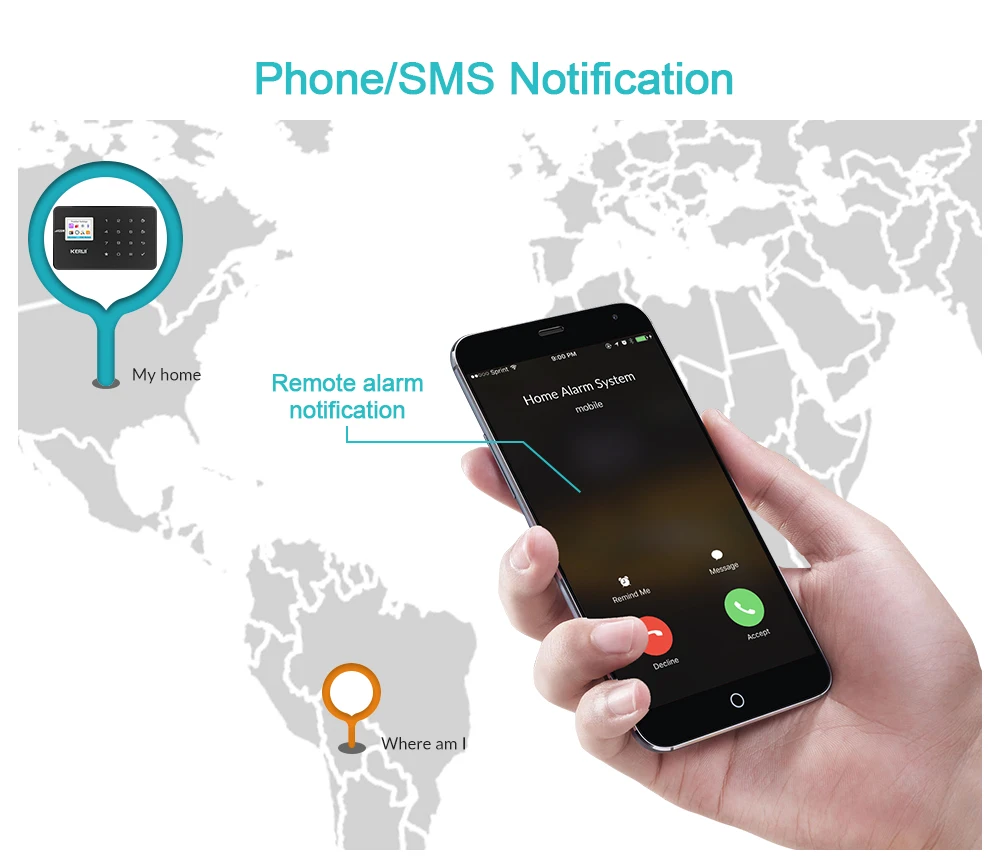 Когда датчик двери и детектор движения PIR срабатывают, сирена зазвучала и отпугивала вора. В то же время, владелец будет уведомлен по телефону, SMS и APP push.