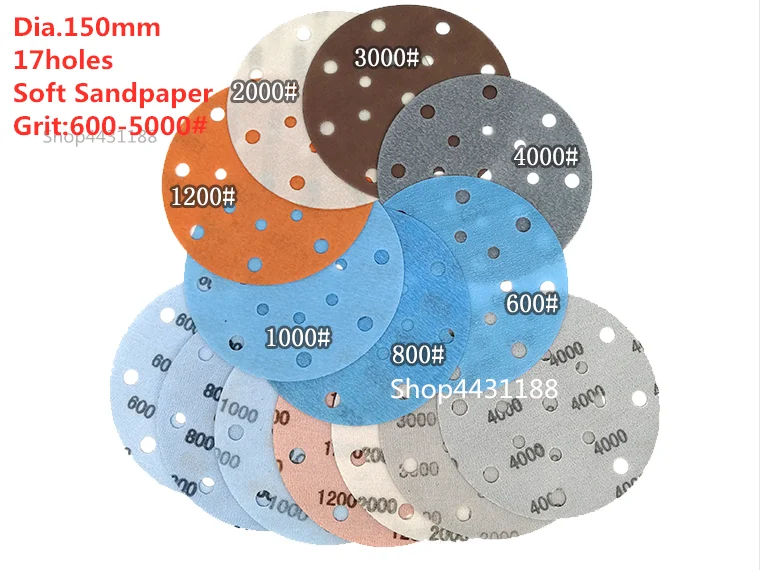 Dia.150 мм 17 отверстий, 6 дюймов мягкая наждачная бумага 600-5000grit тонкая шлифовальная наждачная бумага для полировки автомобиля для изогнутой/неровной поверхности