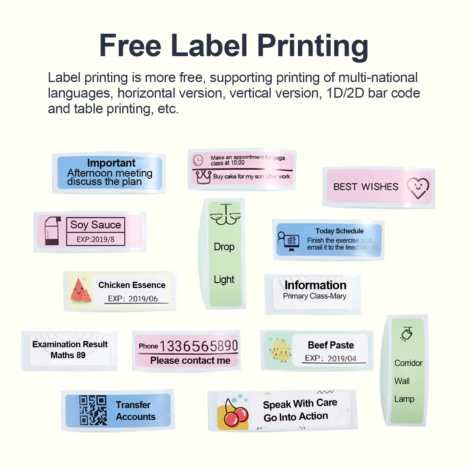 【Free Label Printing】: Label printing is more free, supporting printing of multi-national languages, horizontal version, vertical version, 1D/2D bar code and table printing, etc. App has a lot of material bank, enrich your label creation.
