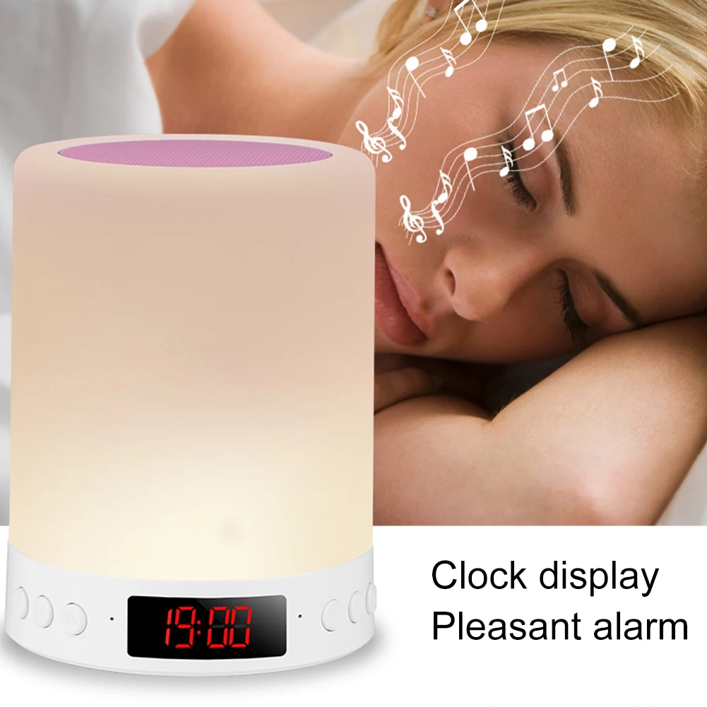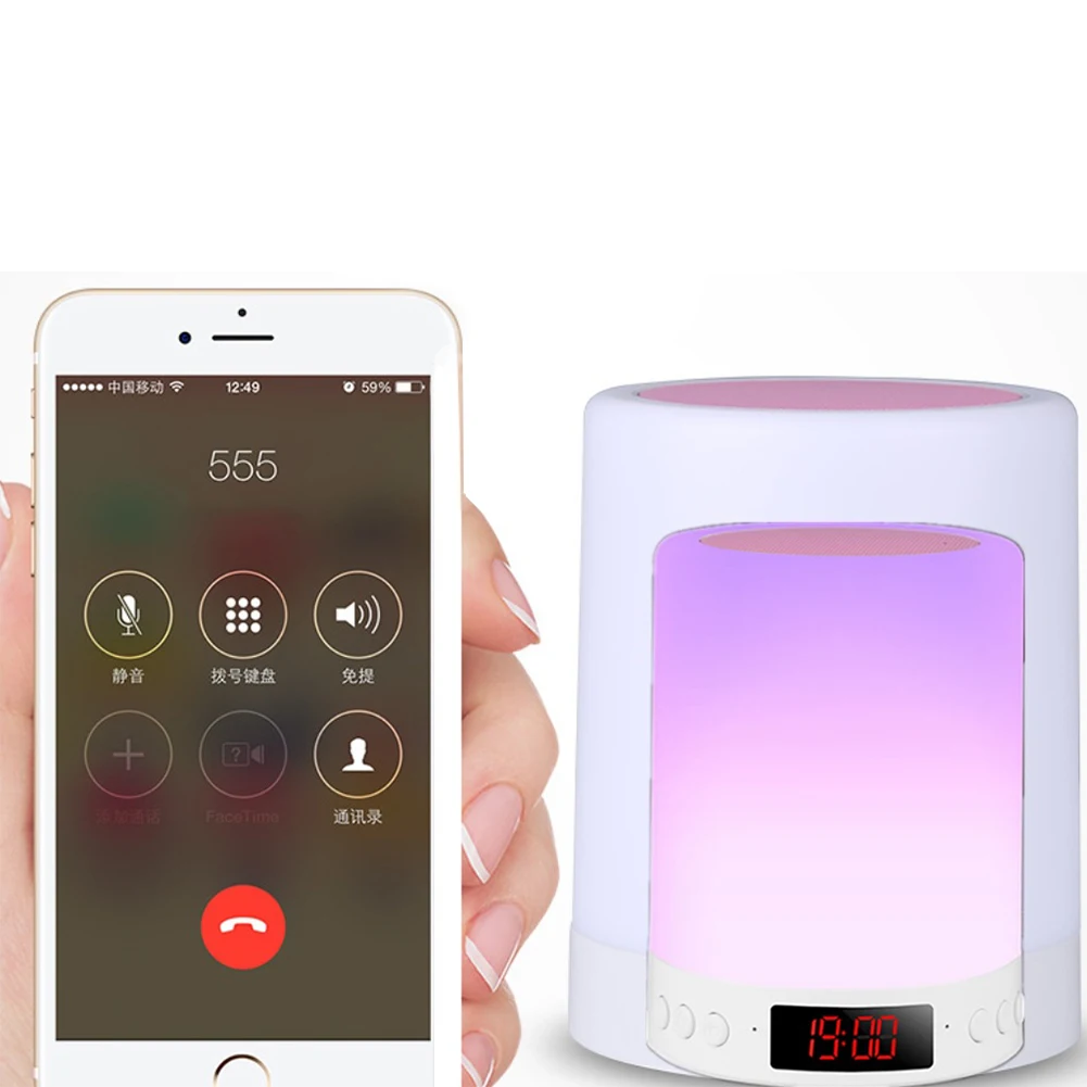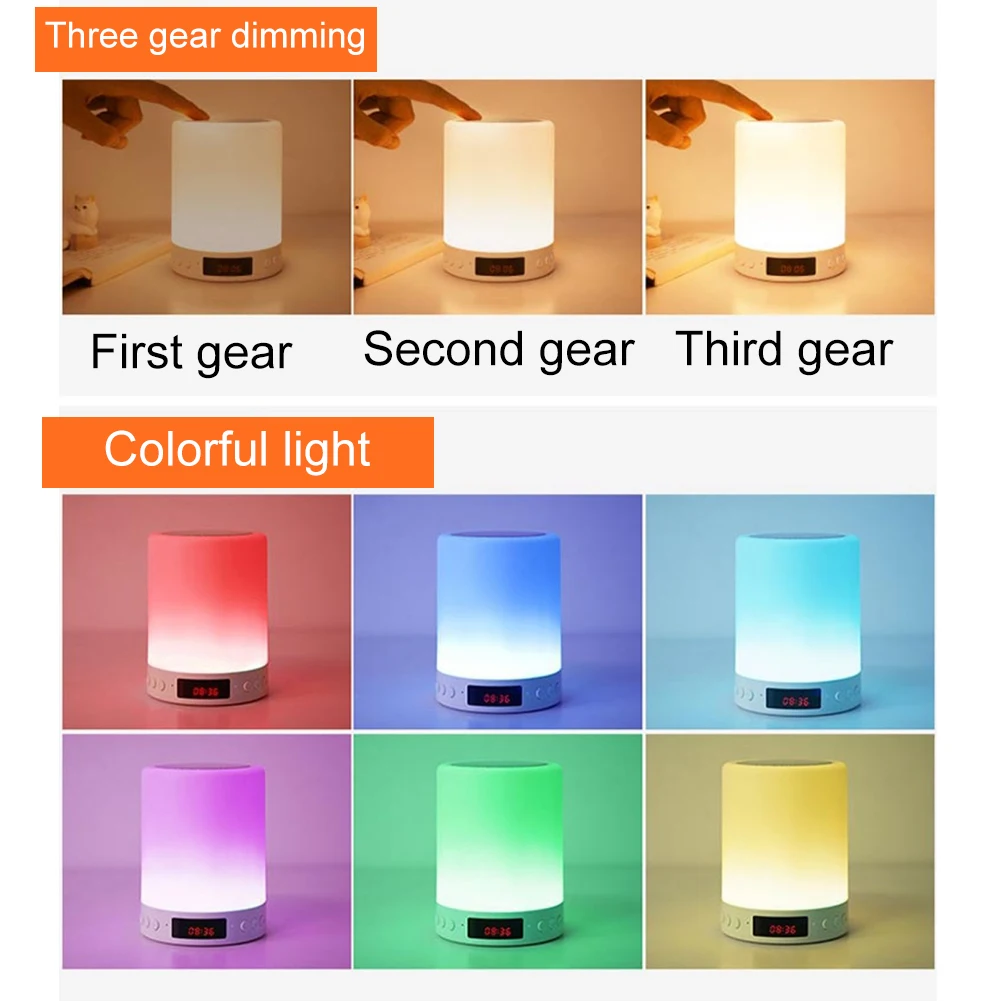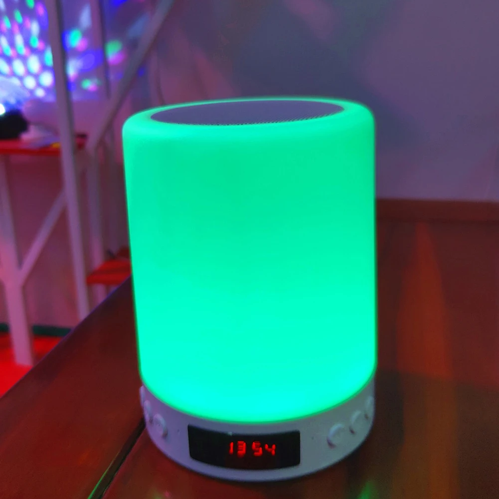 Features: 1.Small Size with Powerful Volume and Immersive Sound. This stereo Subwoofer with TF Card Slot Function.Compatible with most Devices and perfect for home audio player and outdoor activities speaker. 2.Six Light color can be changed by touching the circular sensor on the top of the lamp. And gives you a natural smooth sleep. 3.Easily Operation. Support Play and also support TF card ,with pressing the ''mode'' button to switch. When the light color stay on blue for 3-5 seconds,It would automatically keeps change colors to pink, purple, green,orange and other colors . And also you could stop the color change to stay on a certain color, just press the metal circular sensor again. 4.High Capacity Battery. Built-in 3.7V 1800mAh Lithium Ion Battery. 5.Compatible with most Devices and perfect for home audio player and outdoor activities speaker. Specification: Material: ABS Light color: RGB Power supply: built-in rechargeable lithium battery(3.7V/1800MAH ) Voltage: ≤36V Output power: 3W Frequency response range: 50HZ-20KHZ Signal to noise ratio:75dB Distortion: ≤0.5% Transmission distance: 10m Charging time: 2.5-4h Product size: 95mm x 122mm Weight: 250g Package includes: 1 x nightlight speaker 1 x USB charging cable 1 x user manual