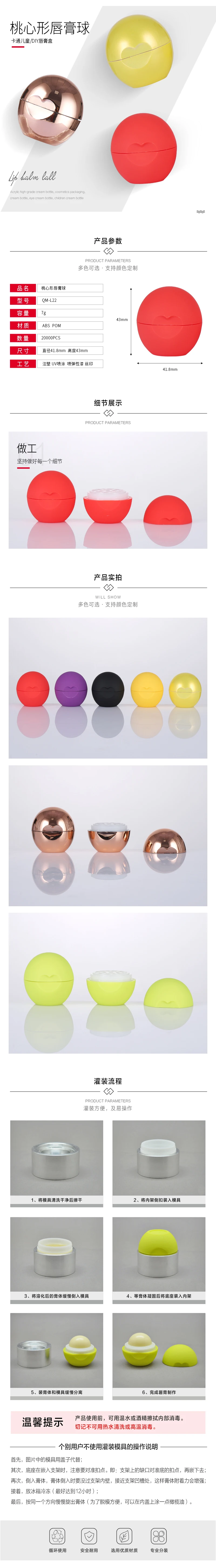 Material:New PP,Colorful New Ball Style Lipstick Tube No MoldColor:Green/Red/Pearl Yellow /Pearl Blue/Black/Yellow/Purple/Rose GoldSize :D43 x H41.8mmWeight:20gCapacity : 8-10gQuantity : 140sets/lot(140pcs Bottle + 140pcs Lid)Pls 2lots one time.Get 5% Discounts by System AutomaticallyPicture Show