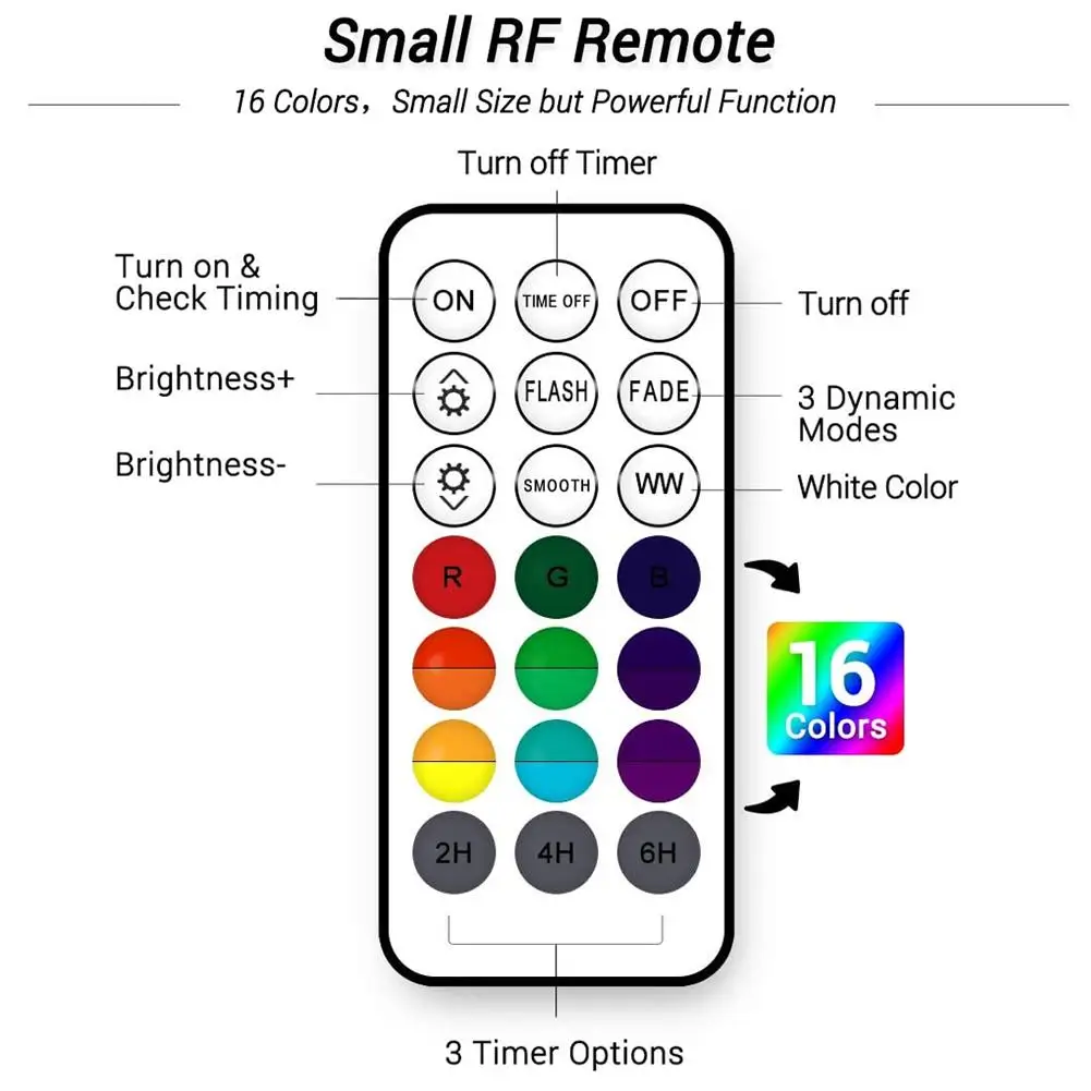 3. Свет с пультом дистанционного управления: с радиочастотным пультом дистанционного управления, лампу можно стабильно управлять под водой. Расстояние воздушного контроля может достигать 30 м и 5 м в воде. Он оснащен 16 видов цветов, тремя режимами изменения, регулируемой яркостью и переключателем таймера.