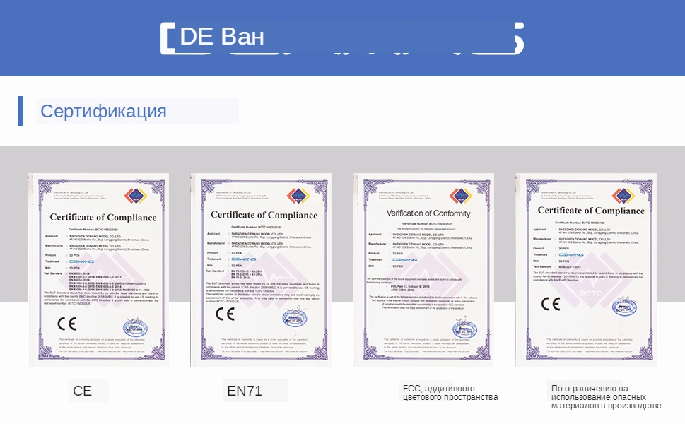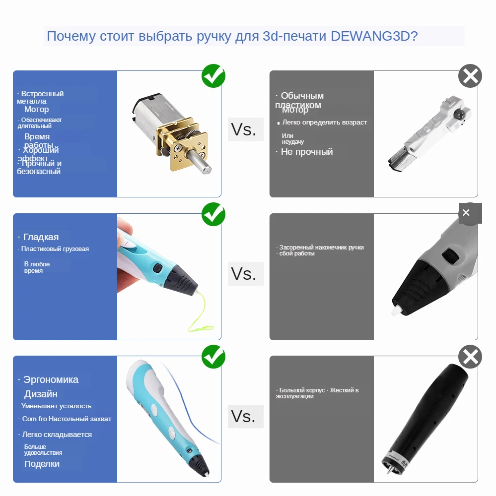 Мы разрабатываем наши 3D ручки и 3D-принтеры на отзывы тысяч конечных пользователей. Это позволяет нам включить все наиболее желаемые функции в дизайн нашей продукции. DEWANG 3d ручка имеет сертификацию CE, ROHS, FCC, EN71. DEWANG 3D продукты построены на срок.