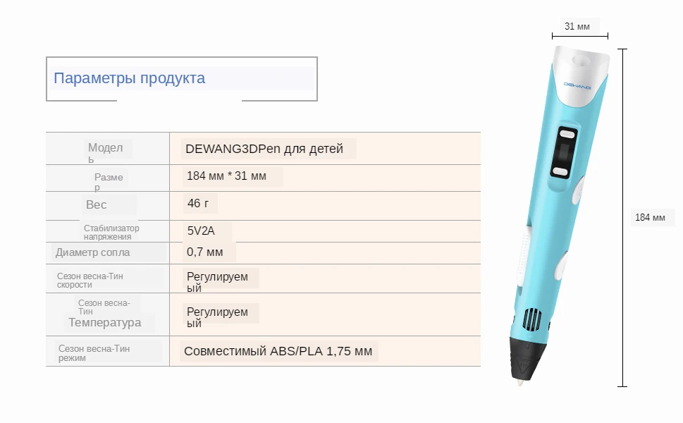 Материал: АБС-пластик Рабочее напряжение: 5 В Рабочий ток: 2A Мощность адаптер переменного тока 100V-240V 50/60Hz 0.35A Адаптированный расходный материал: PLA 1,75 ± 0,02 мм/ABS 1,75 ± 0,02 мм Условия работы: 10 ℃-35 ℃/Относительная влажность: ≤ 85% Температура нагрева: 160 °- 235 °(PLA : 160 °- 210 °; ABS: 210 °- 235 °) Цвет: синий, фиолетовый, розовый, желтый Размер 3d-ручки: 184*31*46 мм/7,2 ''* 1,2 ''1.8'' Вес 3d-ручки: 1,6 унций/46 г