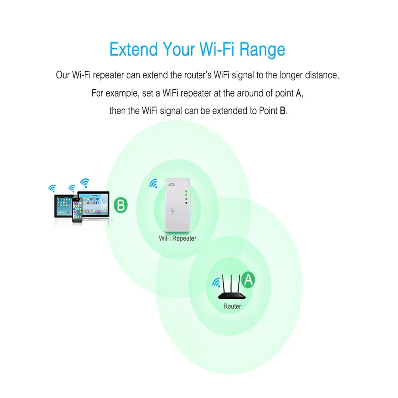 Просто подключите беспроводной удлинитель в стандартный настенный набор розетки на любом смартфоне, планшете или ноутбуке по Wi-Fi или с помощью кнопки WPS или через Настольный кабель RJ45 для подключения к ретранслятору Wi-Fi, позволяет увеличить домашний сигнал Wi-Fi в течение нескольких минут.