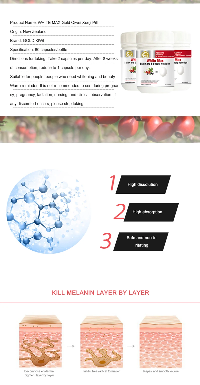 White Max-это естественная и научная Fomula, специально разработанная для поддержки белой и здоровой кожи. Он изготовлен из высокопрочной формулы Conbining 1000 мг плодов шиповника (в капсулах) вместе с травяными экстрактами Nz черной смородины и порошка Proline. Это может помочь защитить от возрастных изменений текстуры и внешнего вида кожи.