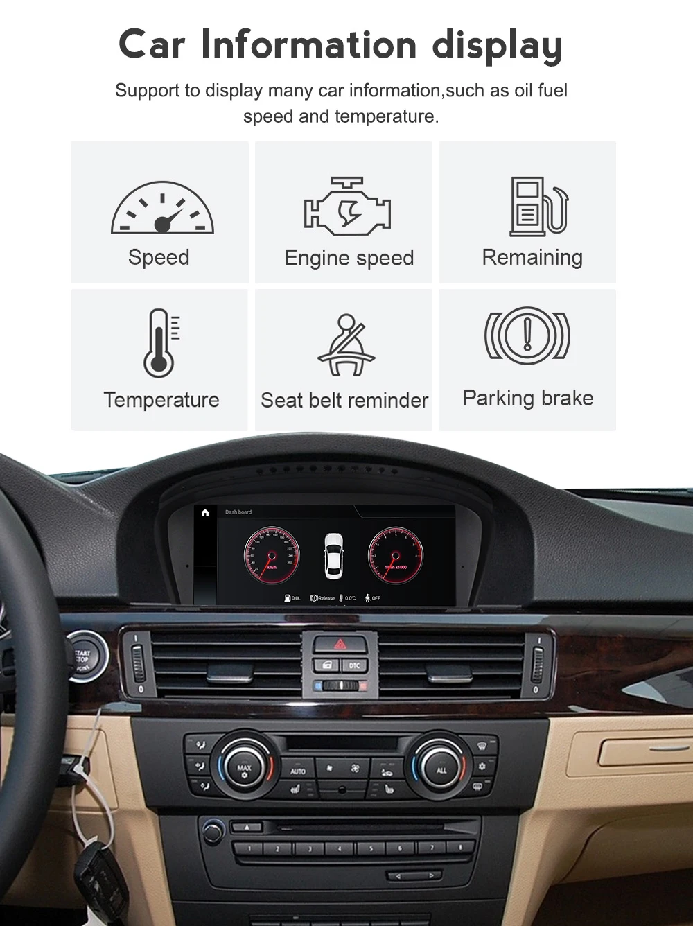 > Поддержка оригинального дисплея информации о автомобиле> Остались масла, наружная температура, батареи вольт, ремни безопасности> Предупреждение, открытие тормоза, жидкость для очистки, поддержка оригинальной информации о автомобильных выключателях ворот,![]()