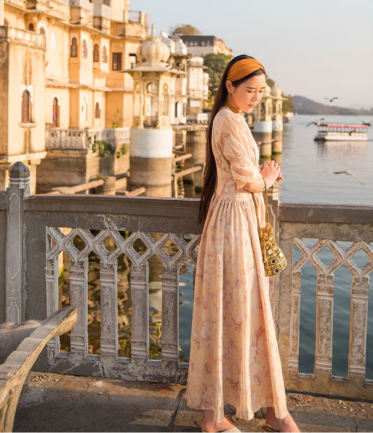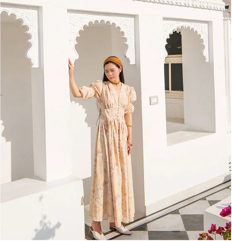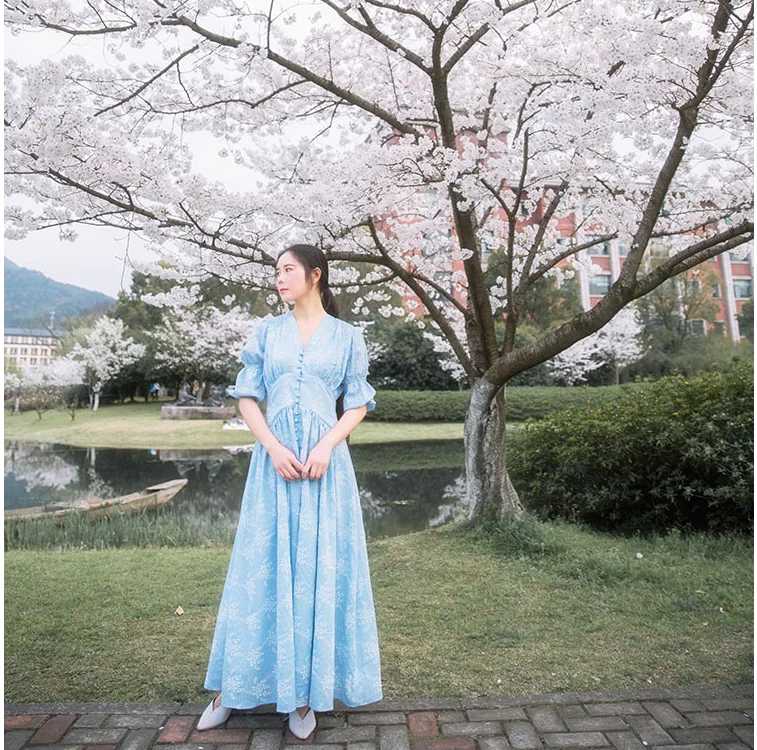 Spring Summer 2019 Women Vintage Elegant Cotton Floral Long Dress Ladies Retro V-Neck High Waist Casual Formal Maxi Dress Fabric:Cotton Color:Yellow/Blue Neck:V-Neck Sleeve:Half Sleeve