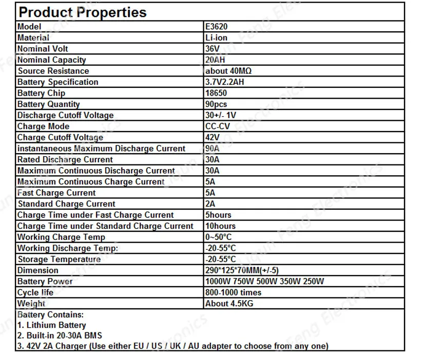 Батарея подходит для двигателя мощностью 250 Вт 350 Вт 450 Вт 500 Вт 650 Вт 750 Вт 800 Вт 1000 Вт (пожалуйста, отметьте мощность двигателя перед покупкой. Спасибо!) 36V ПВХ Электрический велосипед аккумулятор Литий-ионная батарея для электровелосипеда, подходящий мотор-редуктор, бесщеточный двигатель постоянного тока и т. д. Подходит для мотора bafang, мотора Tongsheng, золотого мотора и т. д. Характеристики батареи электрического велосипеда: Номинальное напряжение: 36 В Номинальная мощность: 8Ah-30Ah 36 в 8 Ач Размер: 190*80*70 мм (разница: +/- 5 мм) 36 В 10AH Размер: 195*80*70 мм (разница: +/- 5 мм) 36V 12AH Размер: 195*95*70 мм (рассеивание: +/- 5 мм) 36 в 13 Ач Размер: 195*100*70 мм (рассеивание: +/- 5 мм) 36V 15AH Размер: 195*115*70 мм (рассеивание: +/- 5 мм) 36 в 16 Ач Размер: 200*120*70 мм (рассеивание: +/- 5 мм) 36V 18AH Размер: 195*140*70 мм (рассеивание: +/- 5 мм) 36 в 21 Ач Размер: 295*120*70 мм (рассеивание: +/- 5 мм) 36V 22AH Размер: 295*125*70 мм (разница: +/- 5 мм) 36 в 25 Ач Размер: 375*110*70 мм (рассеивание: +/- 5 мм) 36V 26AH Размер: 375*115*70 мм (рассеивание: +/- 5 мм) 36V 30AH Размер: 275*170*70 мм (рассеивание: +/- 5 мм) Ячейки: Мощный 18650 2000 мАч 2200 мАч 2500 мАч 2600 мАч BMS: 20A-30 Ампер непрерывный 30 ± 10 ампер максимум Подходящий Двигатель: 36 В 150 Вт 200 Вт 250 Вт 300 Вт 400 Вт 500 Вт 650 Вт 750 Вт 800 Вт 1000 Вт Ток зарядки: 2-5A Напряжение отключения зарядки: 42 в Напряжение отключения разряда: 30 в Температура разряда: от-20 до 65 °C Температура зарядки: от 0 до 65 °C Срок службы: ≥ 80% емкости после 800 циклов.