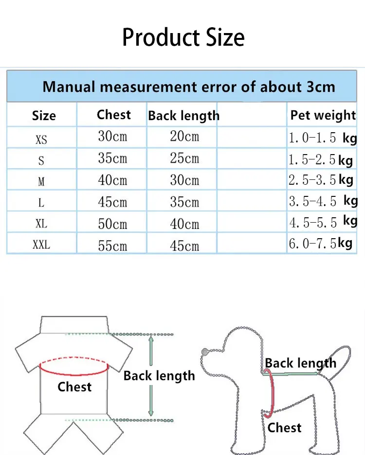 100% новый и высокое качество Количество: 1 Стиль: Повседневный Пол: унисекс Размер: XS,S,M,L,XL,XXL Внимание: поскольку разные компьютеры отображают цвета по-разному, цвет фактического товара может незначительно отличаться от приведенных выше изображений, спасибо за понимание. Все размеры измеряются вручную, могут быть отклонения на 2-3 см, спасибо за понимание Размер: xs,s,m,l,xl,xxl (см) Размер; Длина; Обхват груди (wight) Xs 20 см 30 см 0,5-1 кг S 25 см 5 см 1-2 кг M 30 см 40 см 2-3 кг L 35 см 45 см 3-4,5 кг XL 40 см 50 см 4,5-5,5 кг XXL 45 см 55 см 5,5-7,5 кг